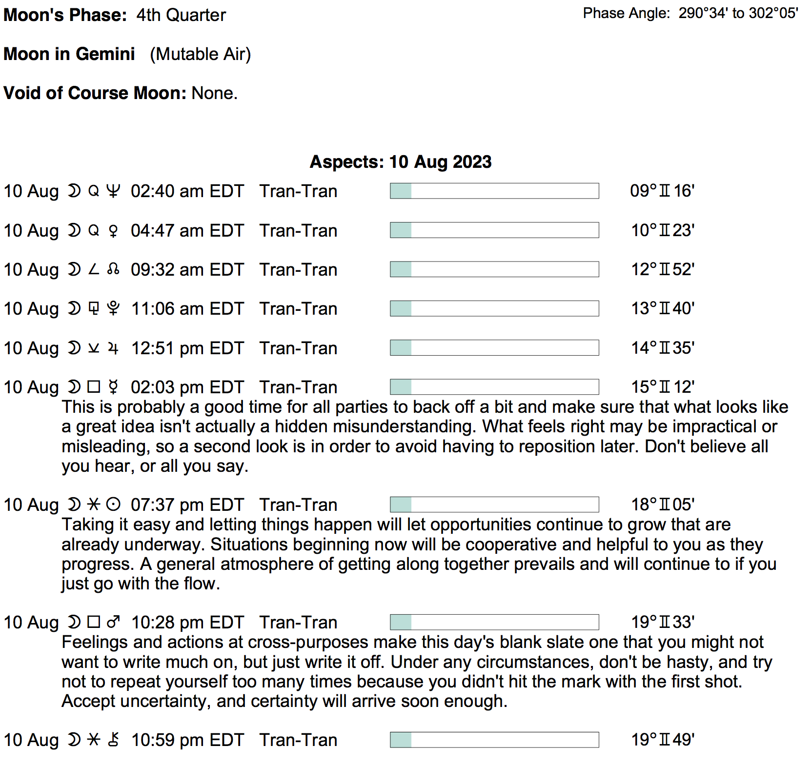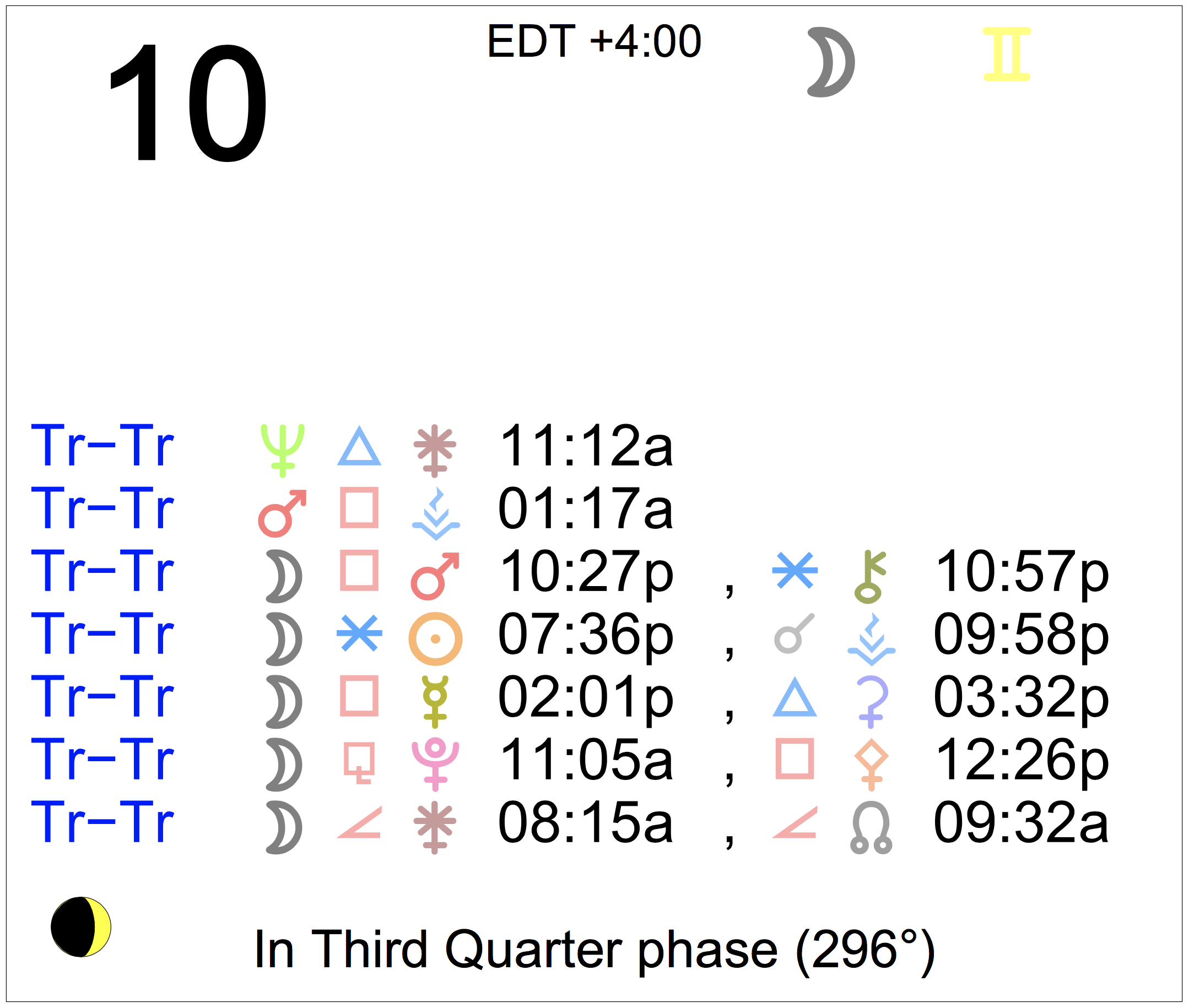 Planet Color Key: The longer the bar, the slower the aspecting planet, and the longer the duration of the planet’s transit.