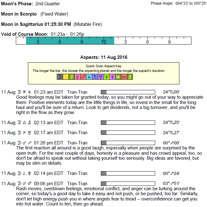 Note that the Moon moves at a rate of approximately one degree every 2 hours, so that if an aspect involving is applying and has an orb of 5 degrees, the aspect will perfect (be exact) in about 10 hours. If the Moon is separating from an aspect with an orb of 2 degrees, it has already formed said aspect approximately 4 hours ago (since the following are positions at noon today, then it would have occurred at about 8 AM today).