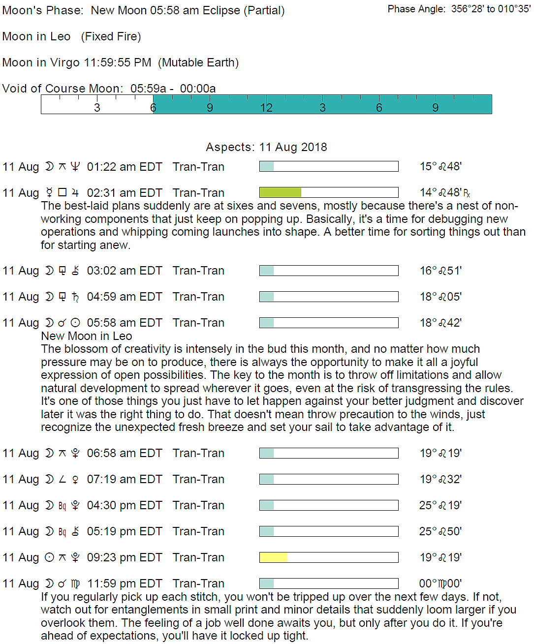 - The partial New Moon Solar Eclipse occurs this morning at 5:57 AM in the sign of Leo. Read more about this Solar Eclipse in Leo on Cafe Astrology.