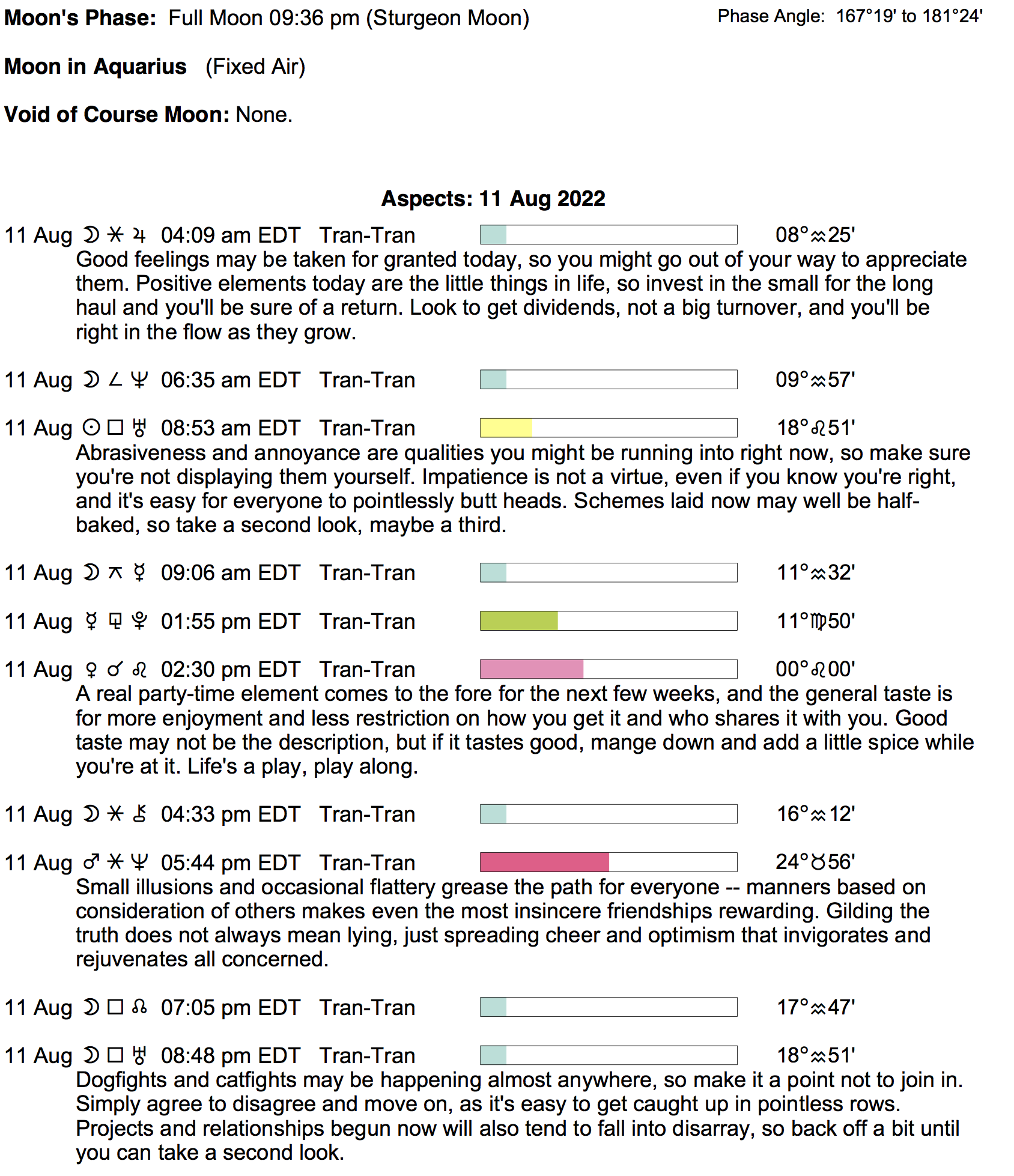 Planet Color Key: The longer the bar, the slower the aspecting planet, and the longer the duration of the planet’s transit.