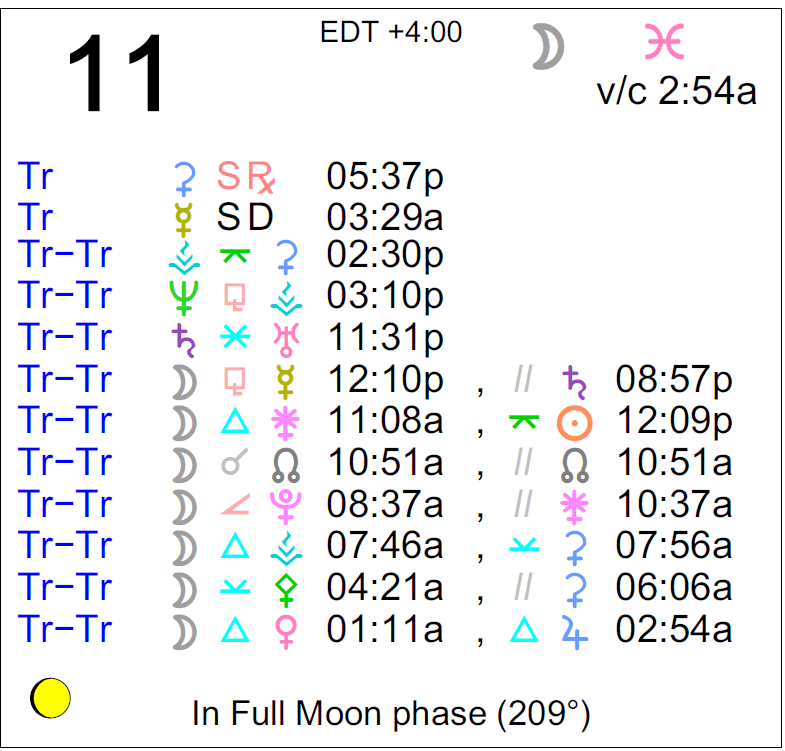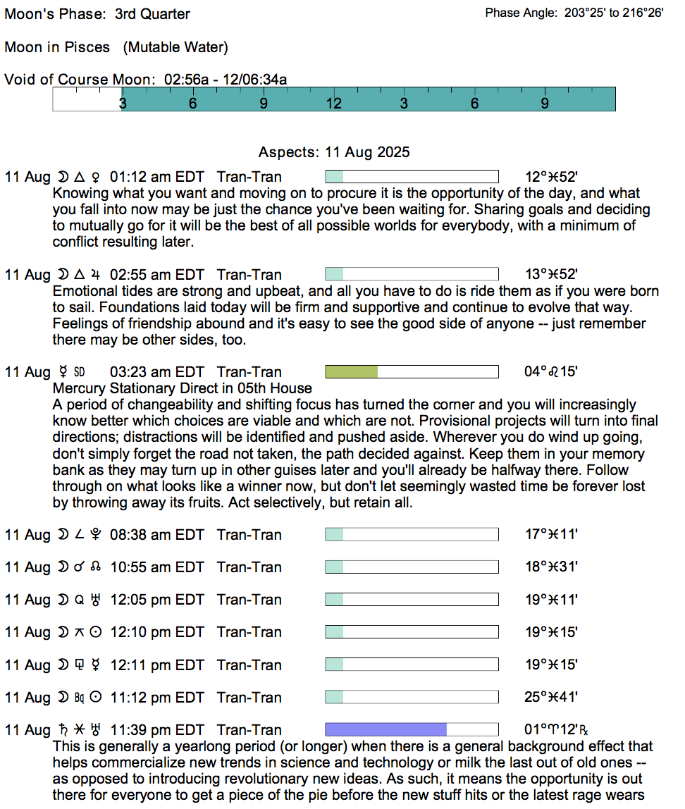 Planet Color Key: The longer the bar, the slower the aspecting planet, and the longer the duration of the planet’s transit.