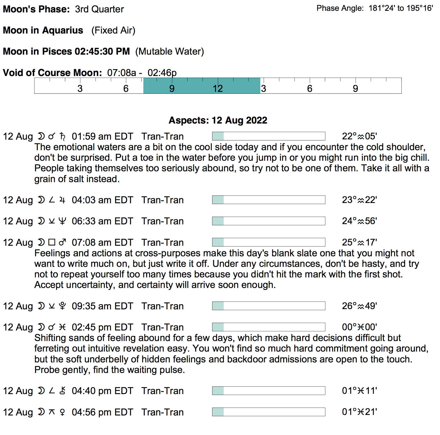 Planet Color Key: The longer the bar, the slower the aspecting planet, and the longer the duration of the planet’s transit.