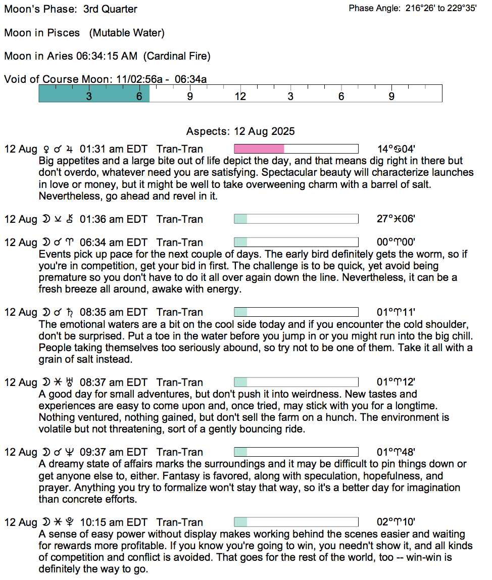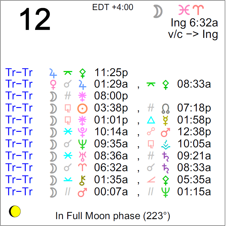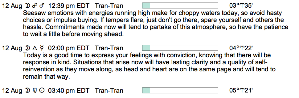Planet Color Key: The longer the bar, the slower the aspecting planet, and the longer the duration of the planet’s transit.
