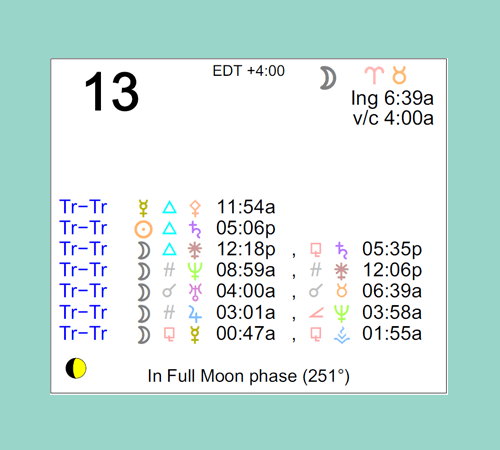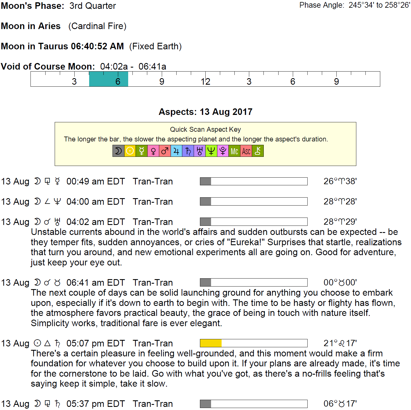 The following aspects (major only) and positions are at noon (EDT) on August 13th: