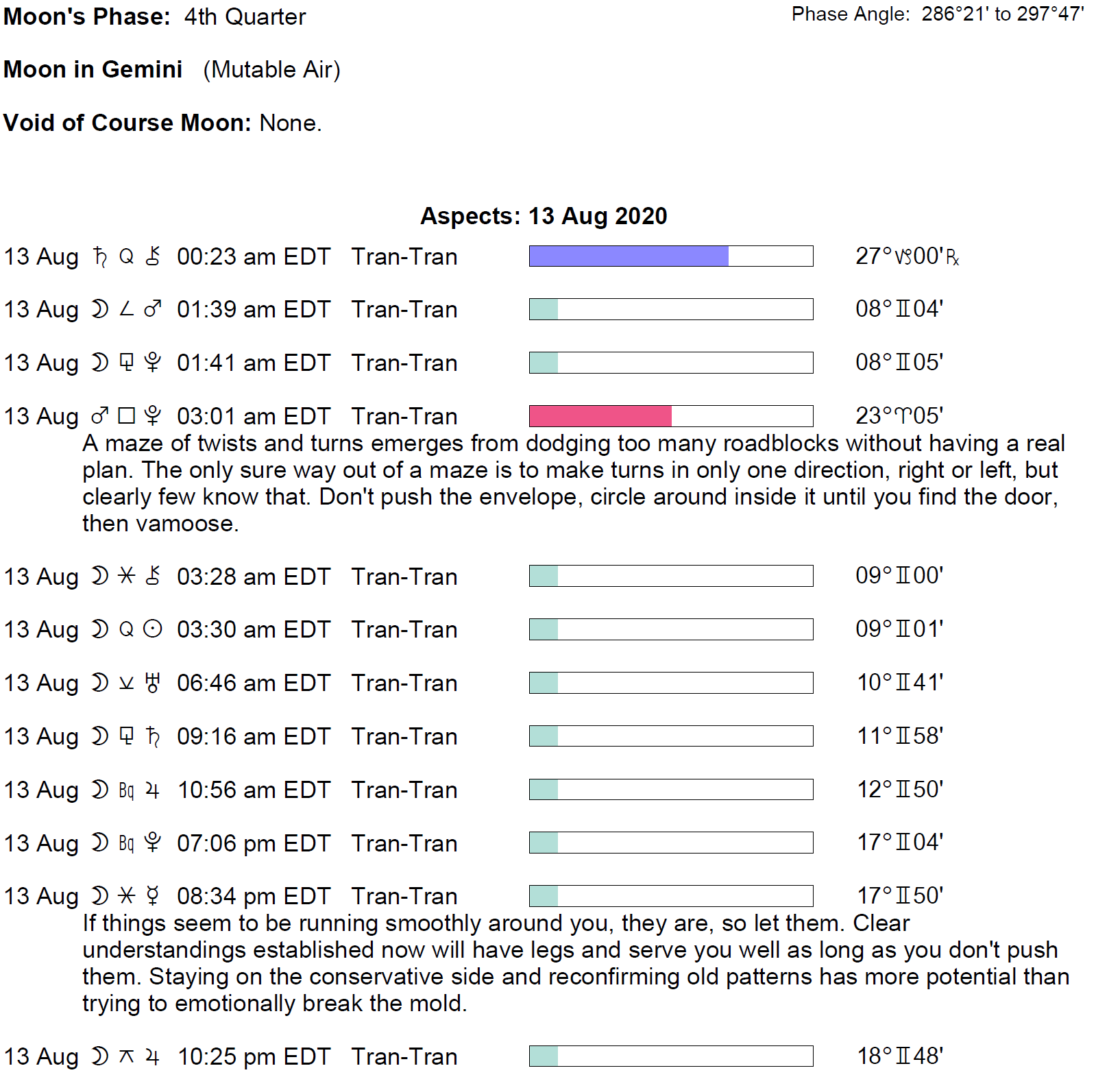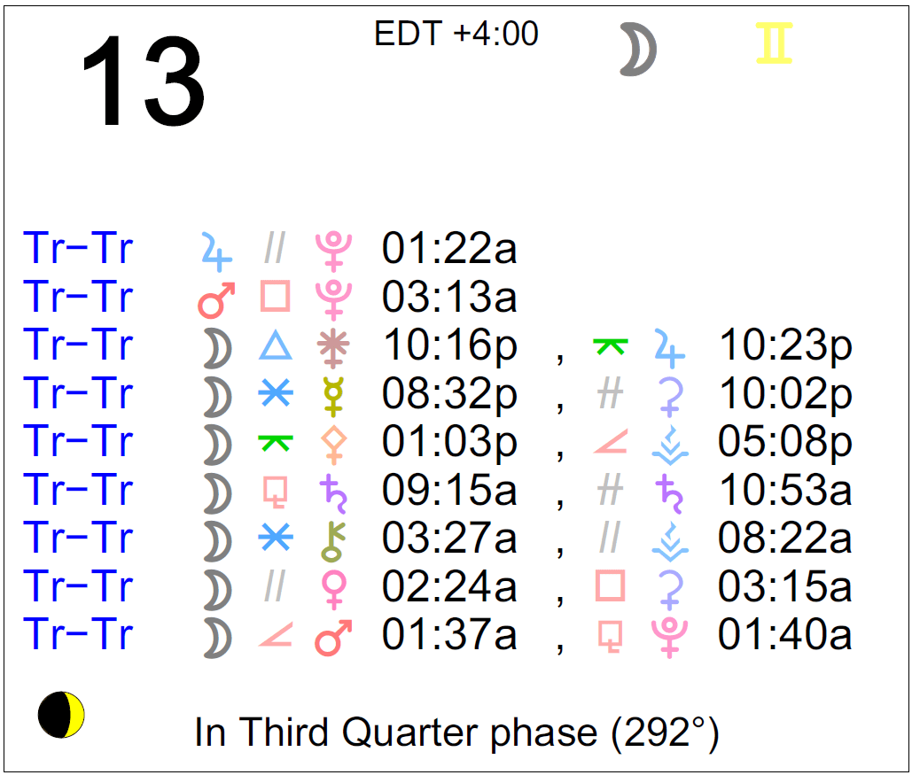 Planet Color Key: The longer the bar, the slower the aspecting planet and the longer the duration of the planet’s transit.