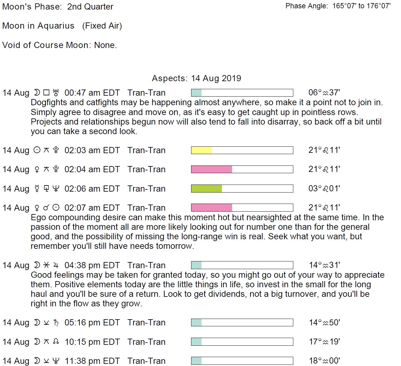 Planet Color Key: The longer the bar, the slower the aspecting planet and the longer the duration of the planet’s transit.