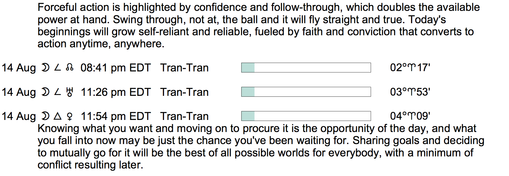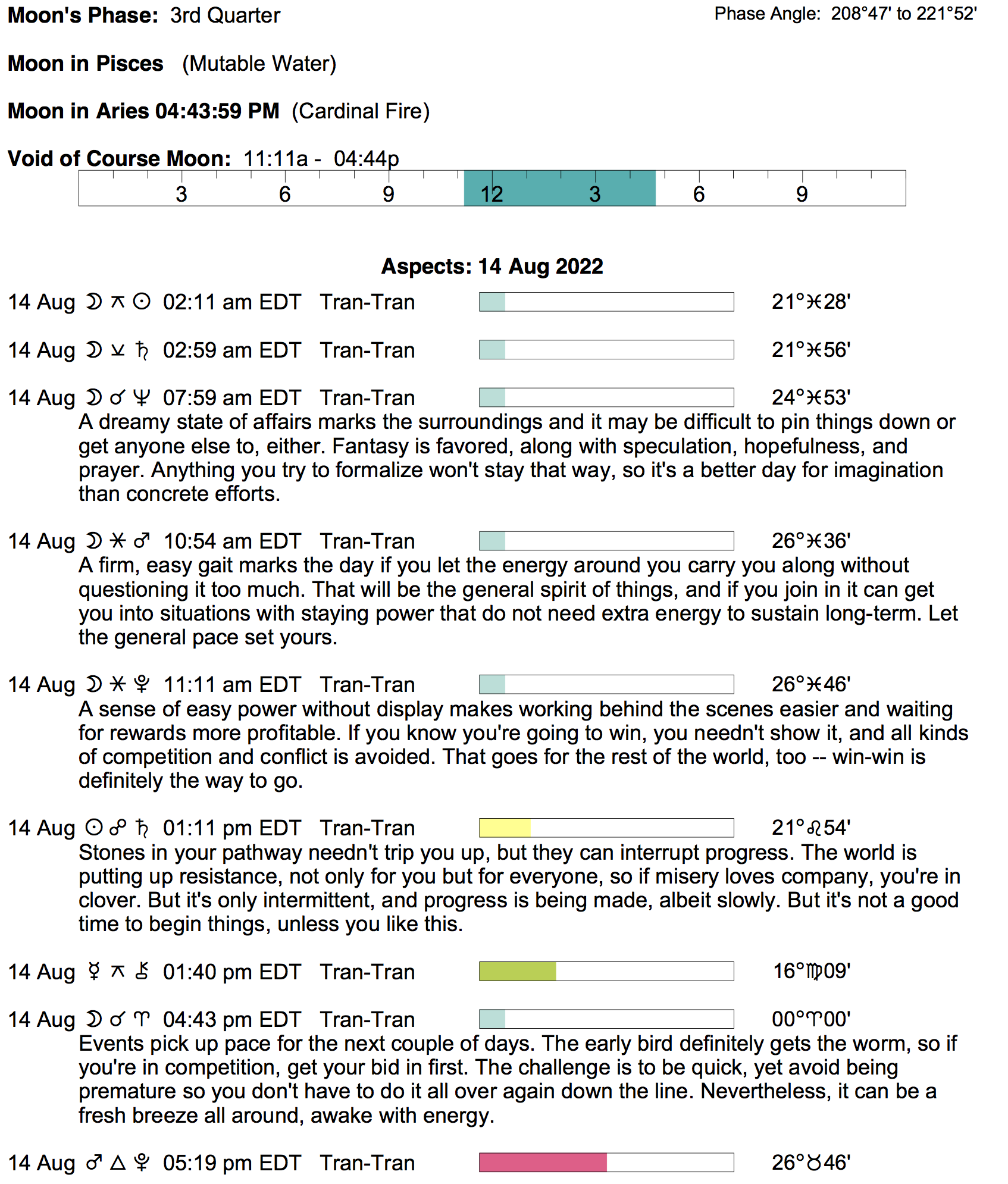 Planet Color Key: The longer the bar, the slower the aspecting planet, and the longer the duration of the planet’s transit.
