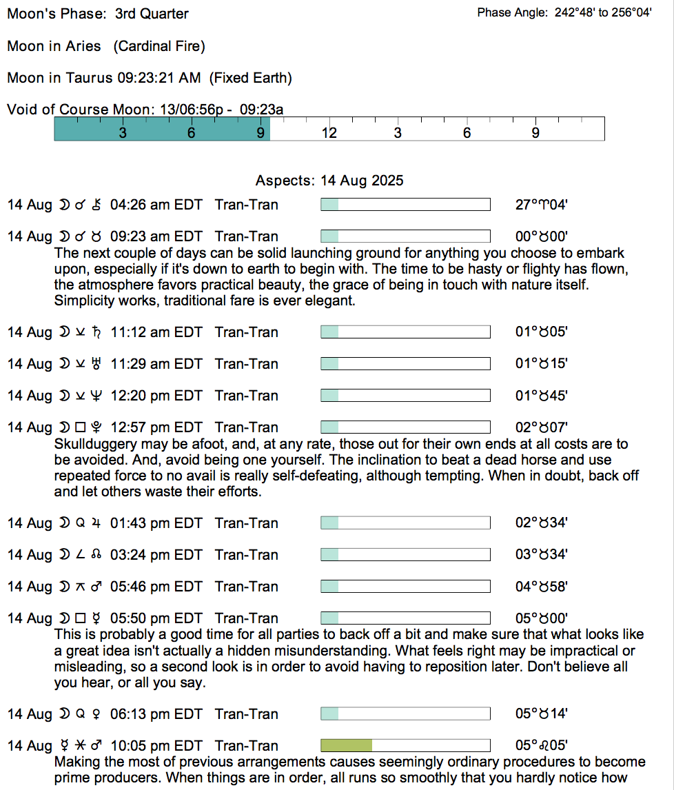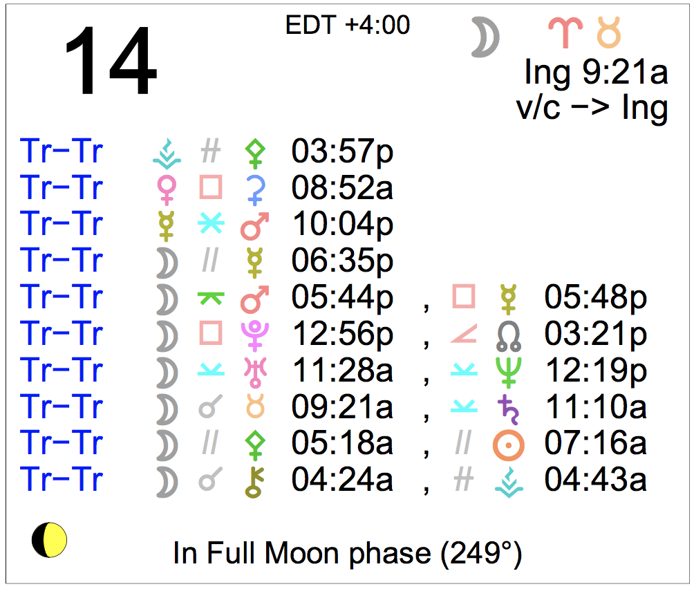 Planet Color Key: The longer the bar, the slower the aspecting planet, and the longer the duration of the planet’s transit.