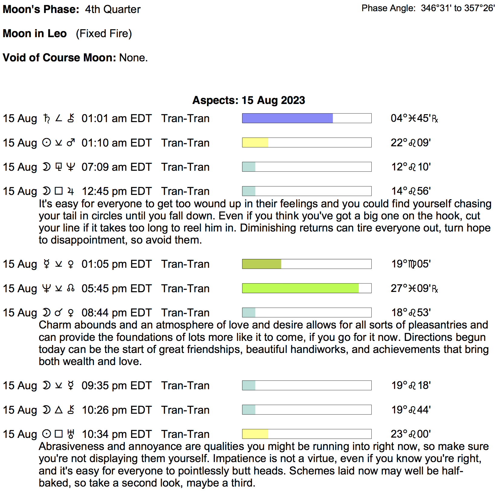 Planet Color Key: The longer the bar, the slower the aspecting planet, and the longer the duration of the planet’s transit.