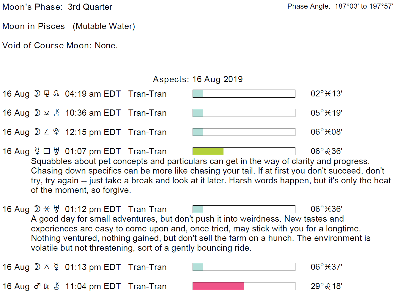 Planet Color Key: The longer the bar, the slower the aspecting planet and the longer the duration of the planet’s transit.