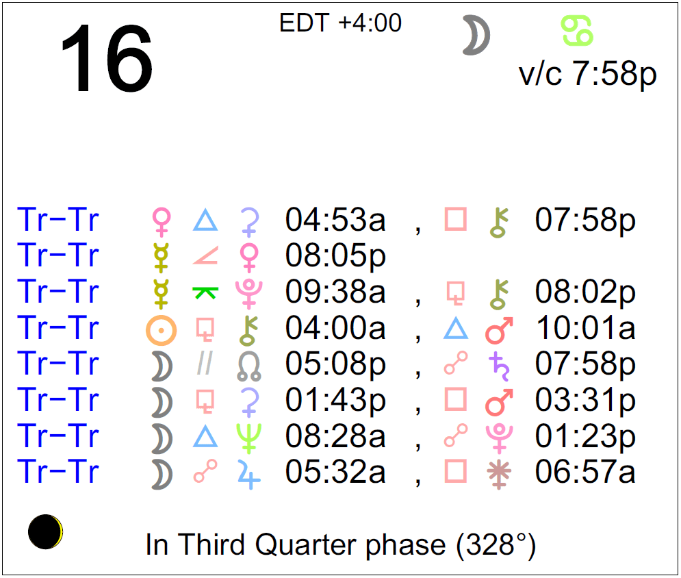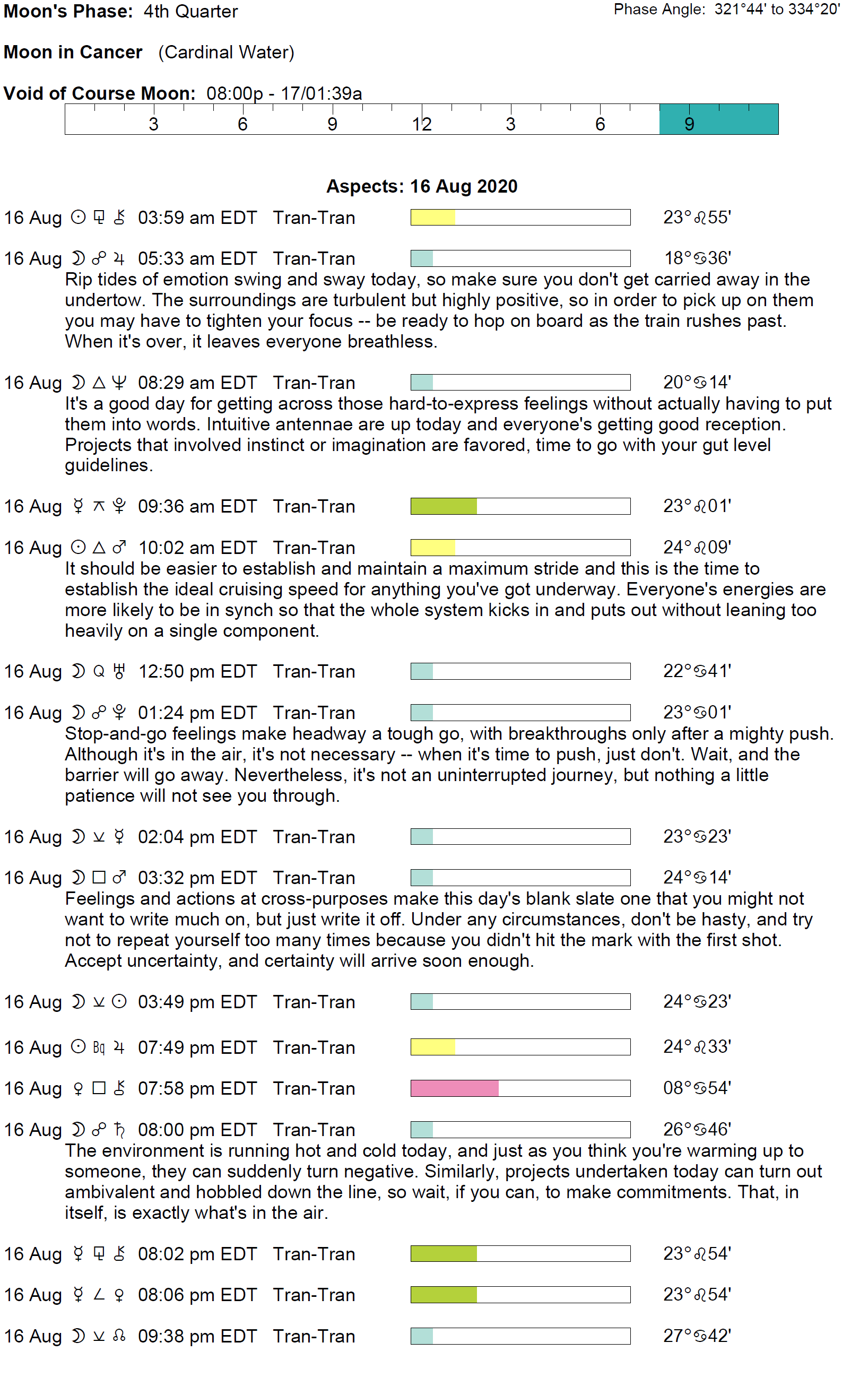 Planet Color Key: The longer the bar, the slower the aspecting planet and the longer the duration of the planet’s transit.