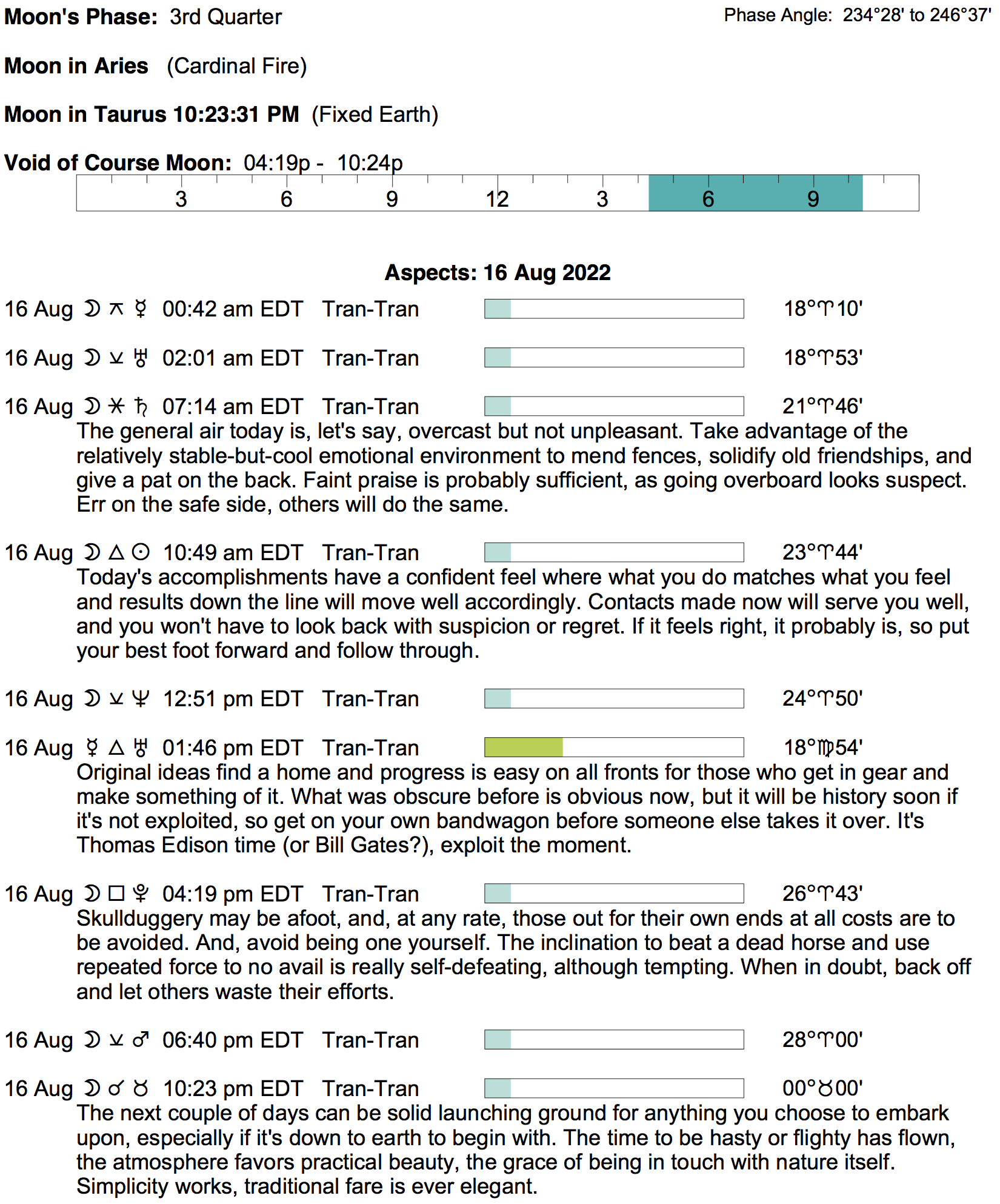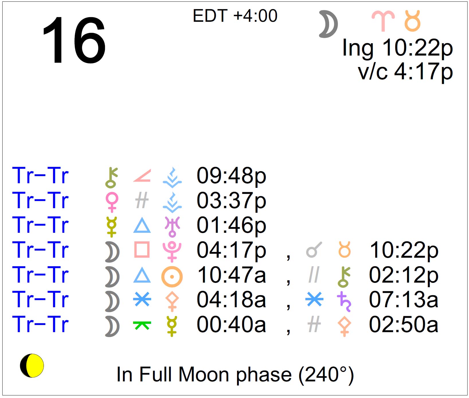 - The Moon is in Aries until 10:22 PM, after which the Moon is in Taurus.
