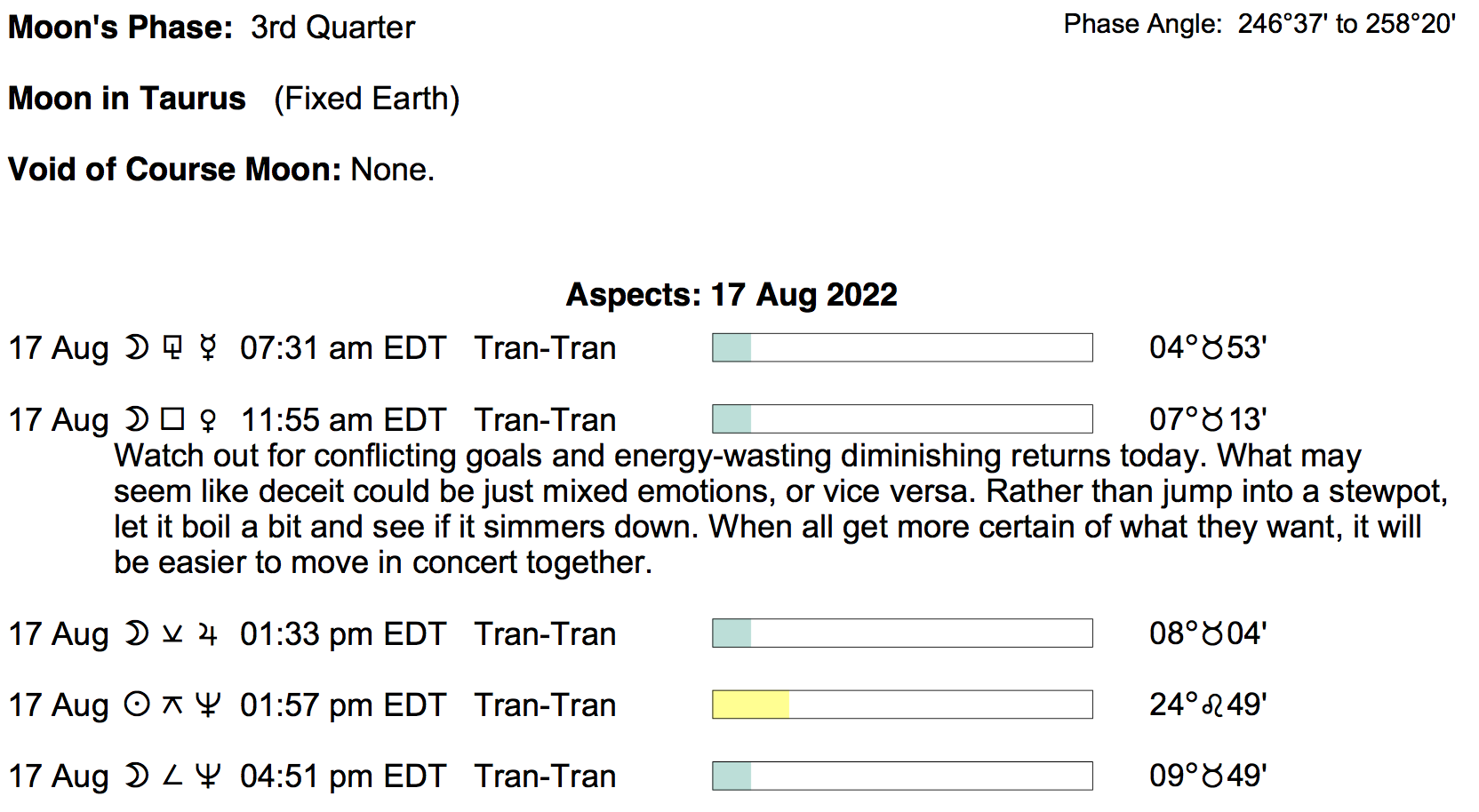 Planet Color Key: The longer the bar, the slower the aspecting planet, and the longer the duration of the planet’s transit.