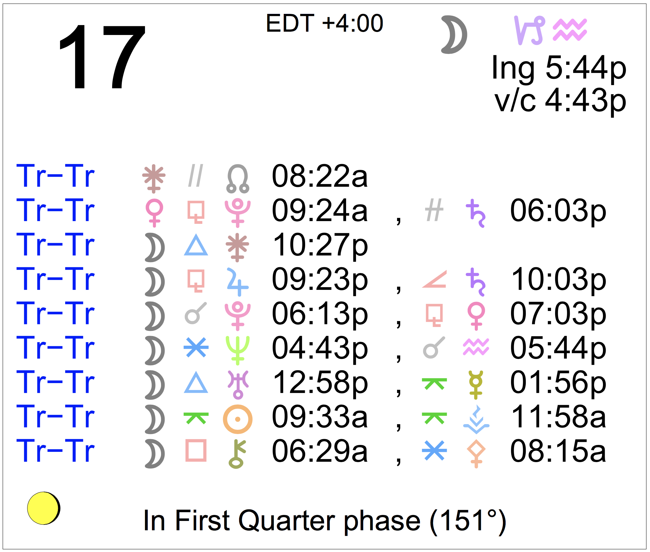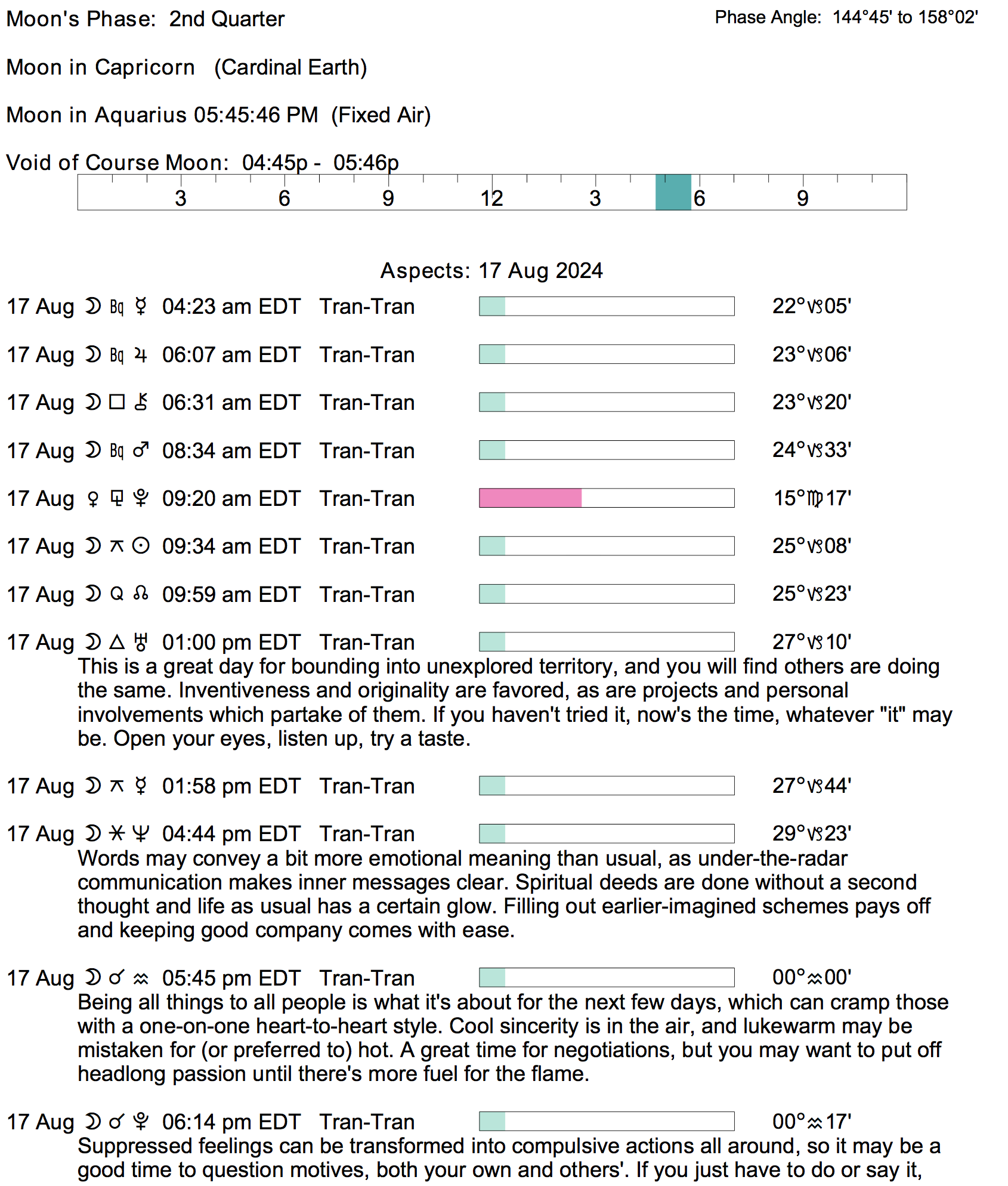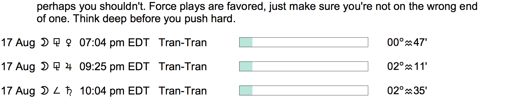 Planet Color Key: The longer the bar, the slower the aspecting planet, and the longer the duration of the planet’s transit.