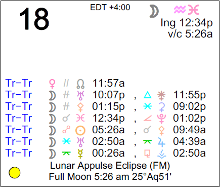 Today’s Full Moon was once defined as an appulse Lunar Eclipse but was later downgraded to a Full Moon, and that’s why you will see it marked as a Lunar Eclipse on many but not all calendars. For astrological purposes, we can consider it a powerful Full Moon or a weak eclipse, but either way, it’s about bringing something that’s been brewing inside of us to a head. This is a time for turning a page, recognizing a situation we’ve previously ignored, and acknowledging feelings. A series of eclipses along the Leo-Aquarius axis is forthcoming, and this series presses us to look more closely at what we may be lacking in our lives. It makes sense to aim for a better balance between expressing ourselves in personal and impersonal ways, and between attention to our own needs and the need to contribute to a team, group, or community.