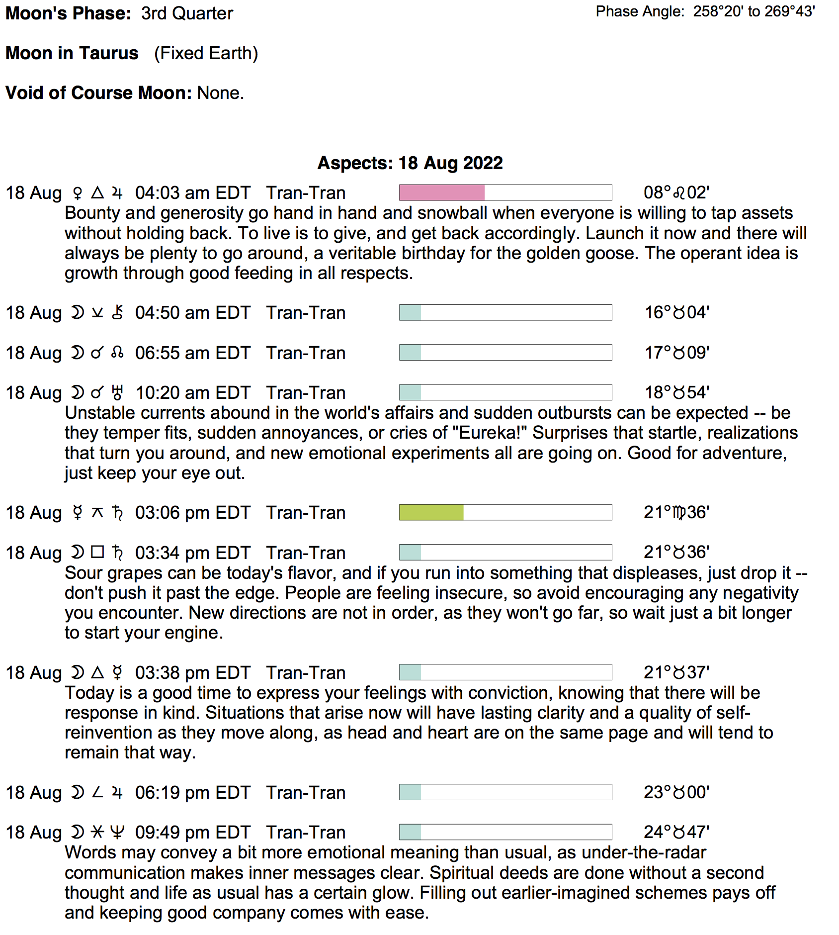 Planet Color Key: The longer the bar, the slower the aspecting planet, and the longer the duration of the planet’s transit.