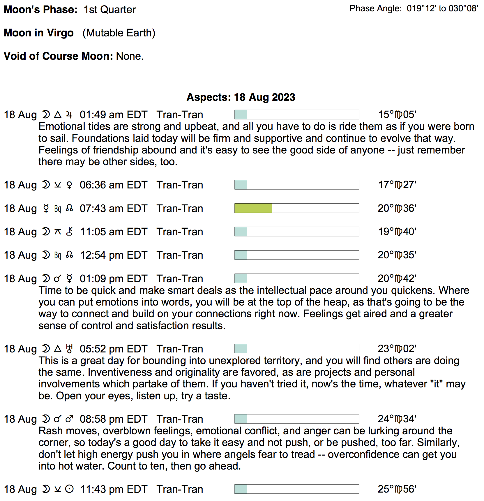 Planet Color Key: The longer the bar, the slower the aspecting planet, and the longer the duration of the planet’s transit.