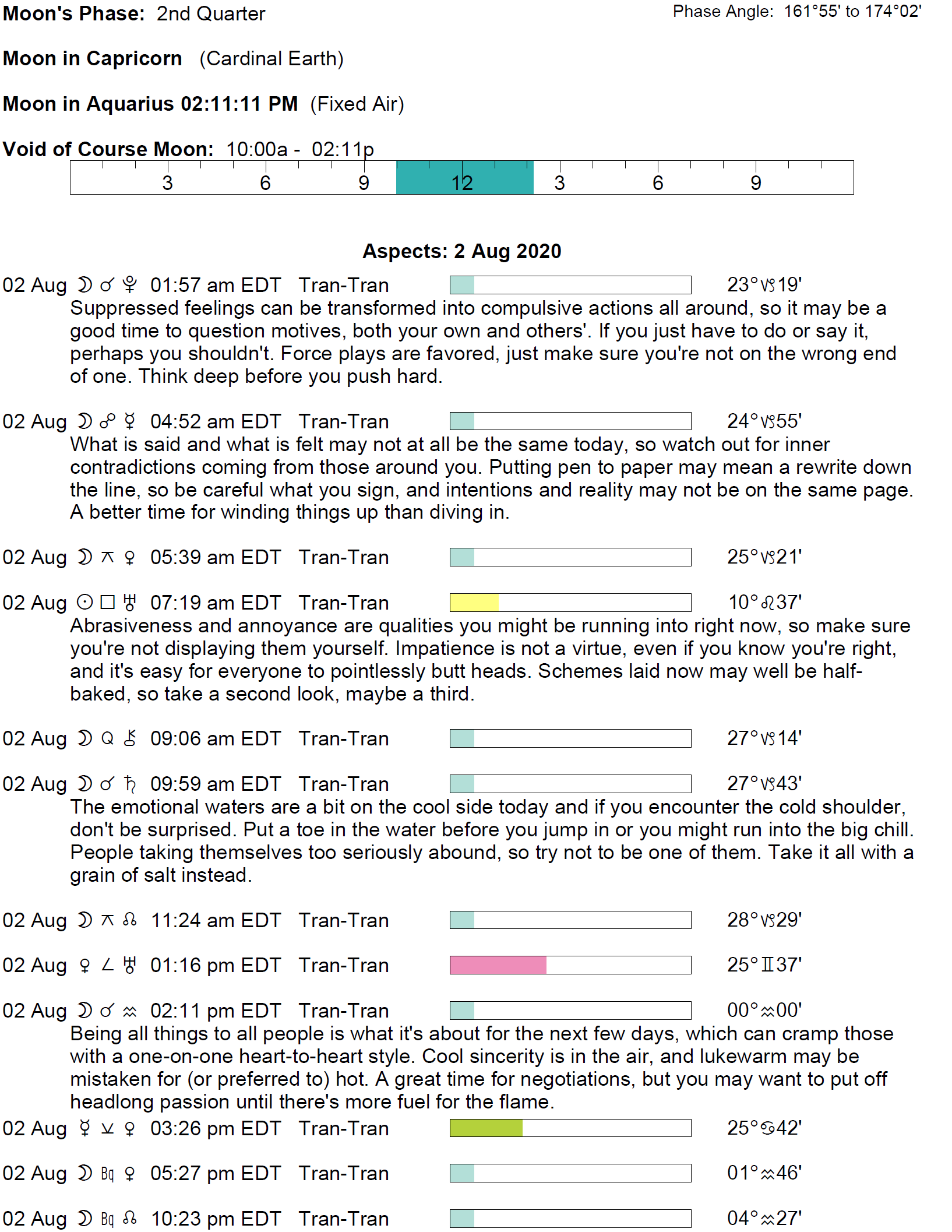 Planet Color Key: The longer the bar, the slower the aspecting planet and the longer the duration of the planet’s transit.