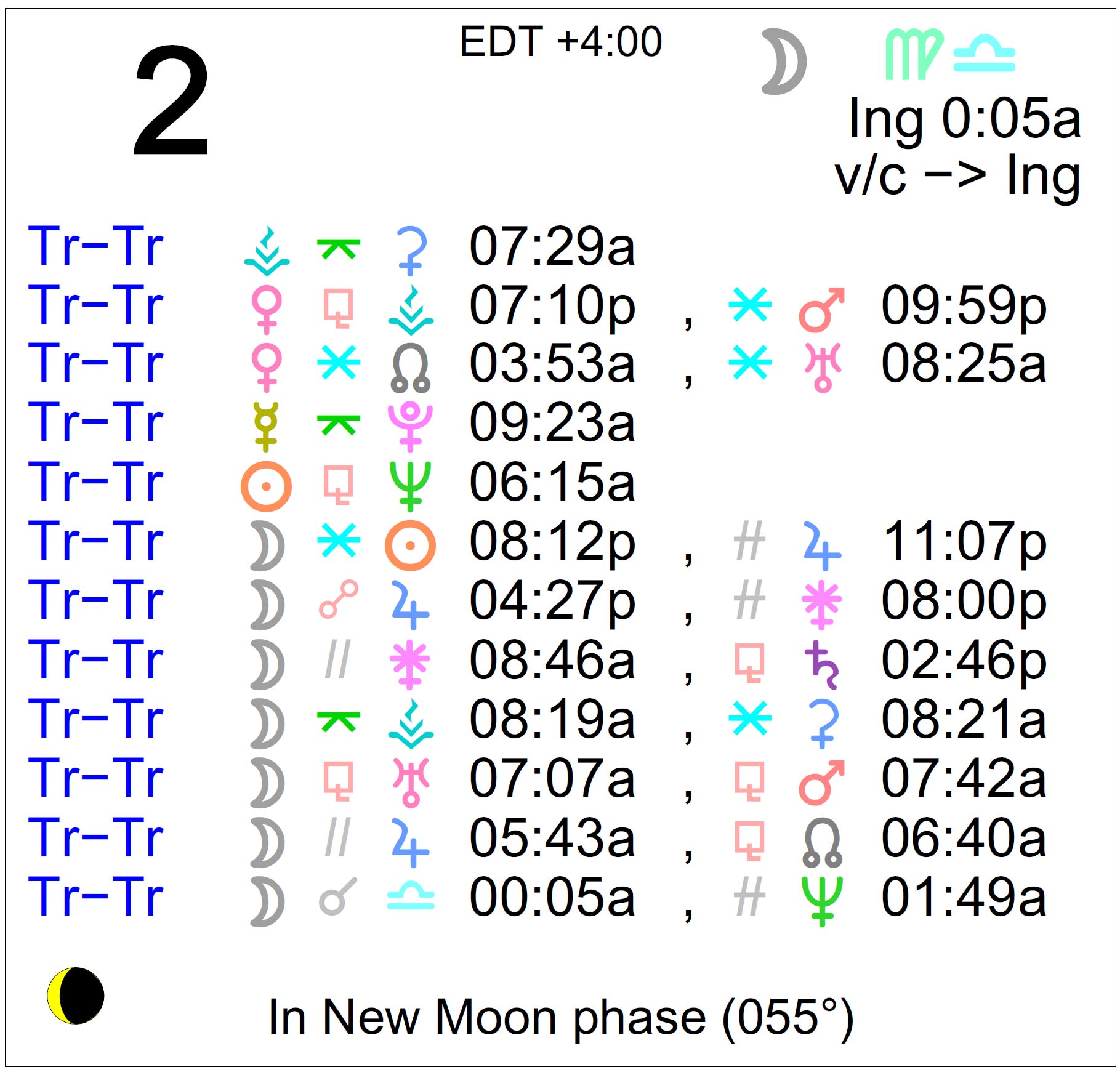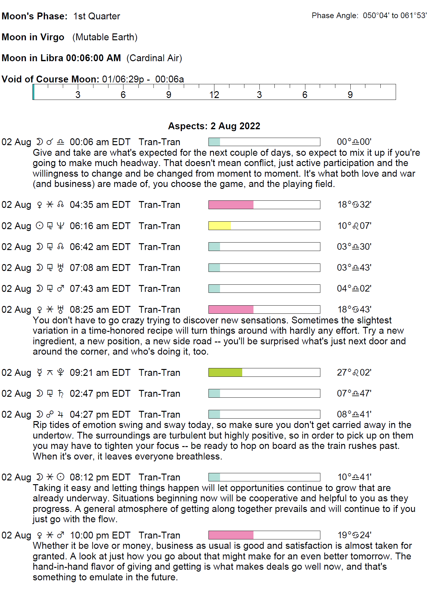 Planet Color Key: The longer the bar, the slower the aspecting planet, and the longer the duration of the planet’s transit.
