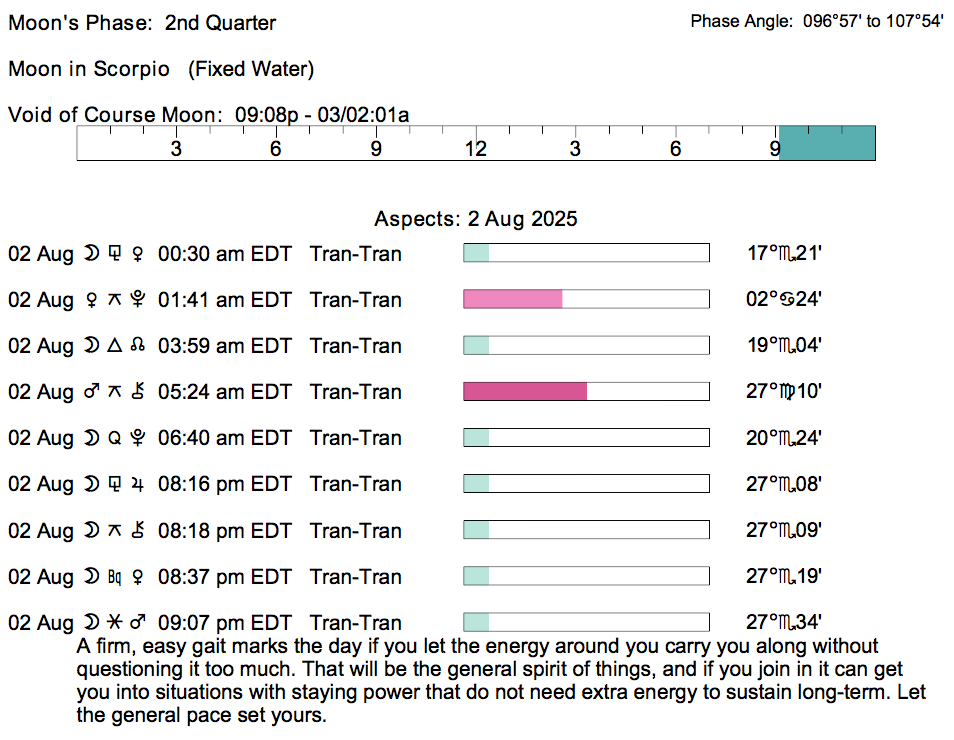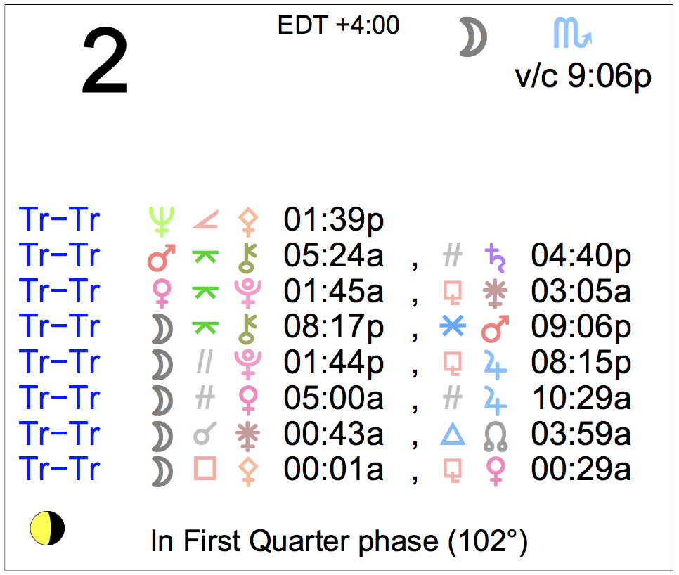 Planet Color Key: The longer the bar, the slower the aspecting planet, and the longer the duration of the planet’s transit.