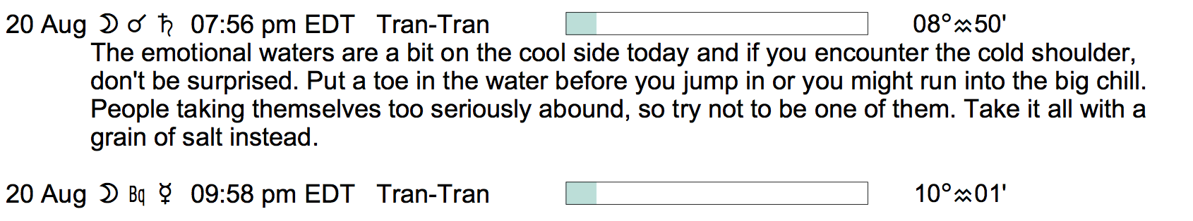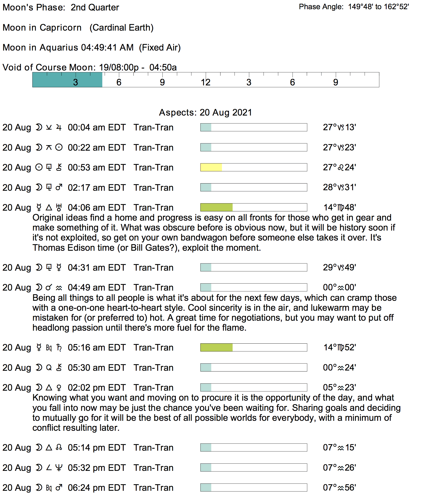 Planet Color Key: The longer the bar, the slower the aspecting planet, and the longer the duration of the planet’s transit.
