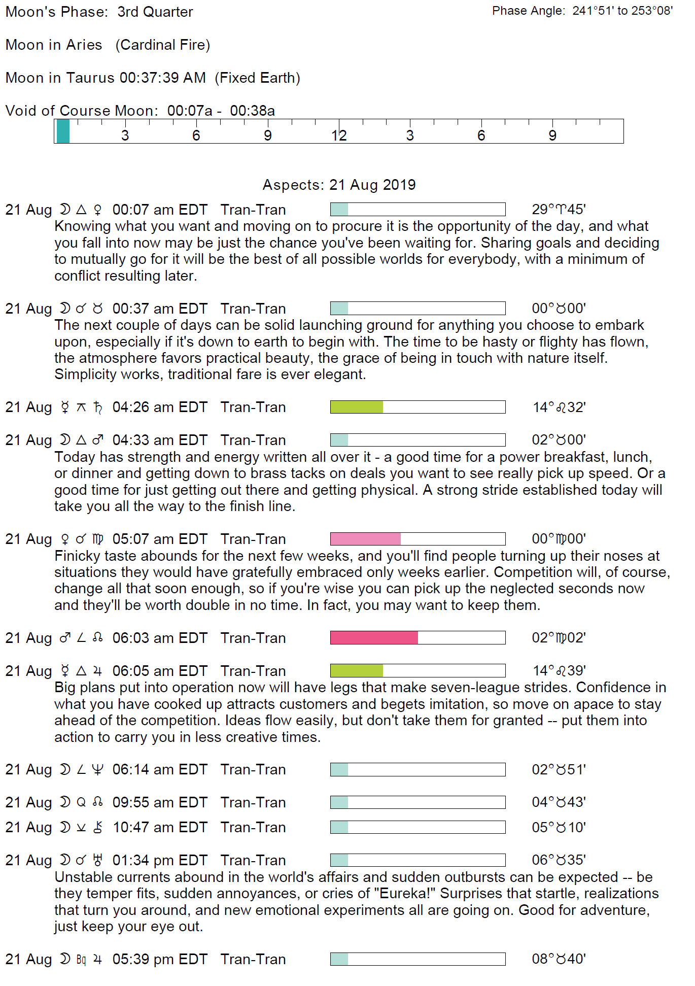 Planet Color Key: The longer the bar, the slower the aspecting planet and the longer the duration of the planet’s transit.