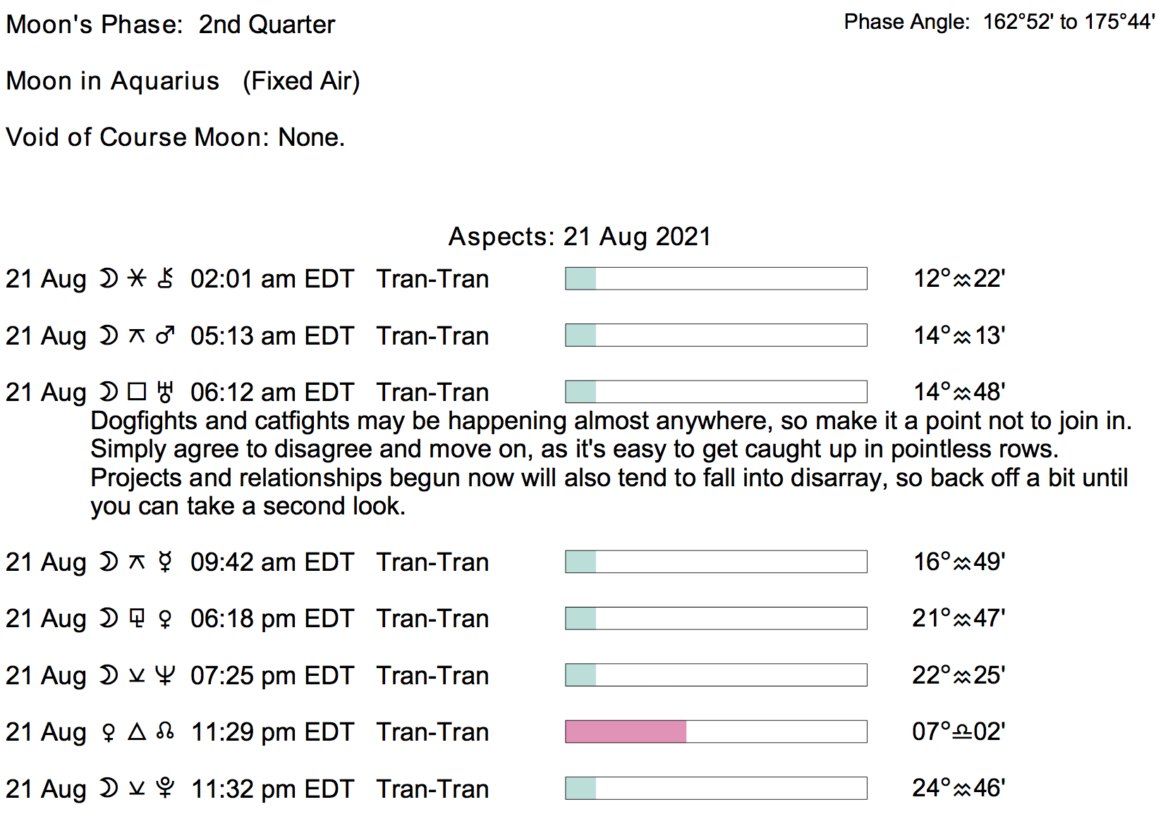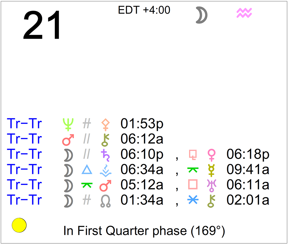 Planet Color Key: The longer the bar, the slower the aspecting planet, and the longer the duration of the planet’s transit.