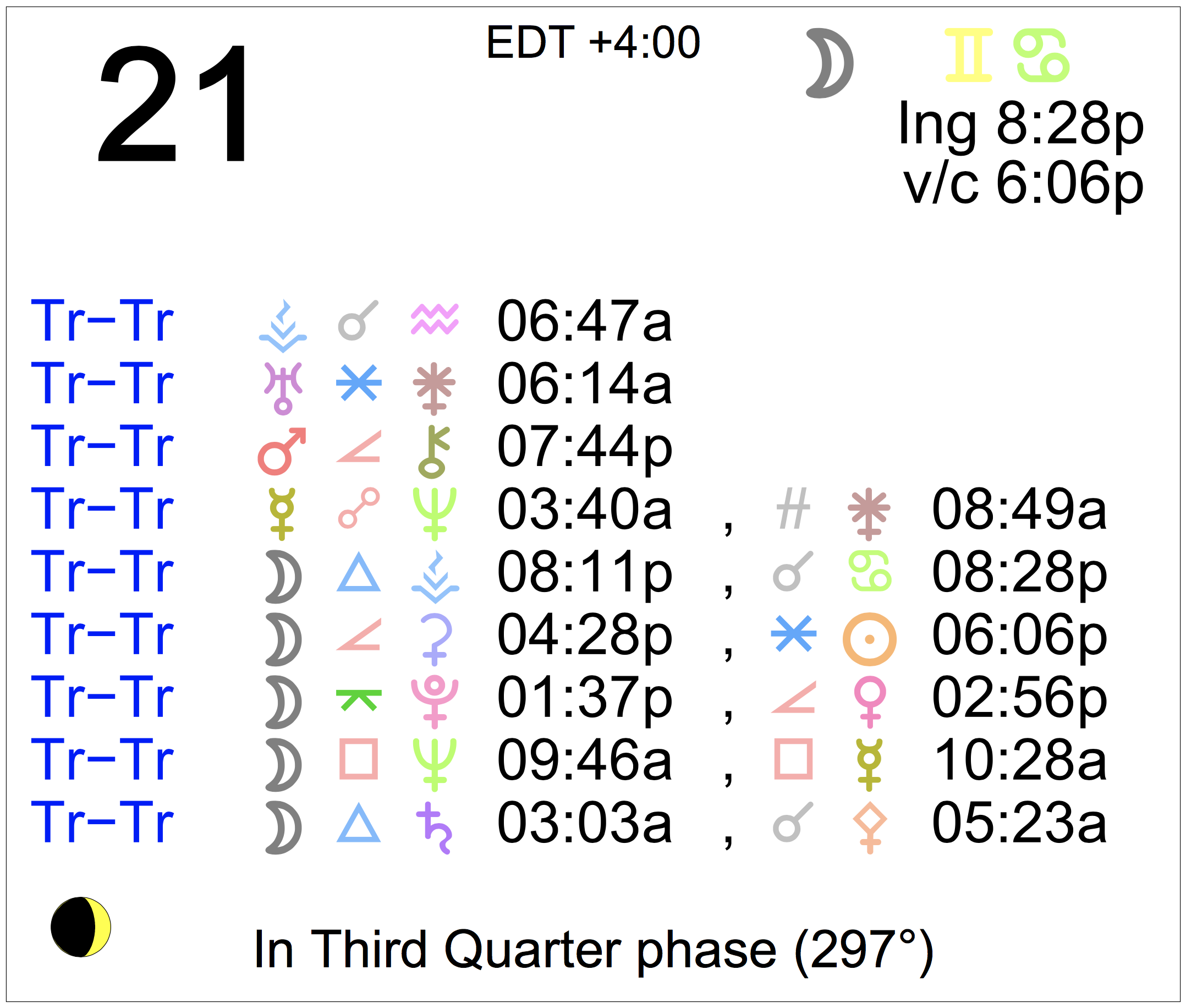 - The Moon is in Gemini until 8:28 PM, after which the Moon is in Cancer.