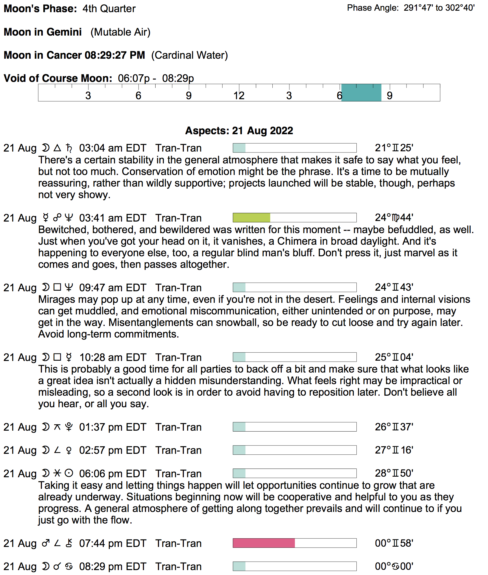Planet Color Key: The longer the bar, the slower the aspecting planet, and the longer the duration of the planet’s transit.