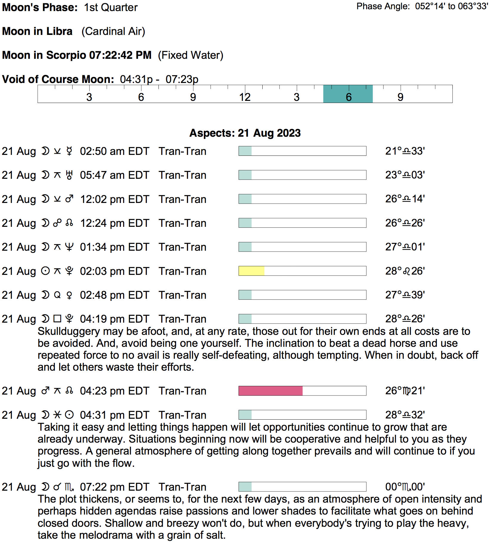Planet Color Key: The longer the bar, the slower the aspecting planet, and the longer the duration of the planet’s transit.