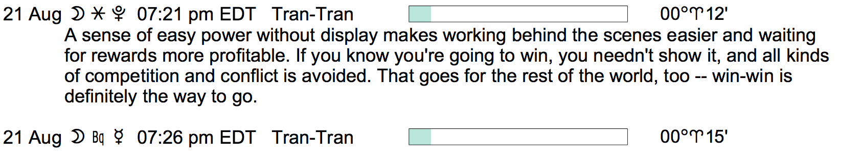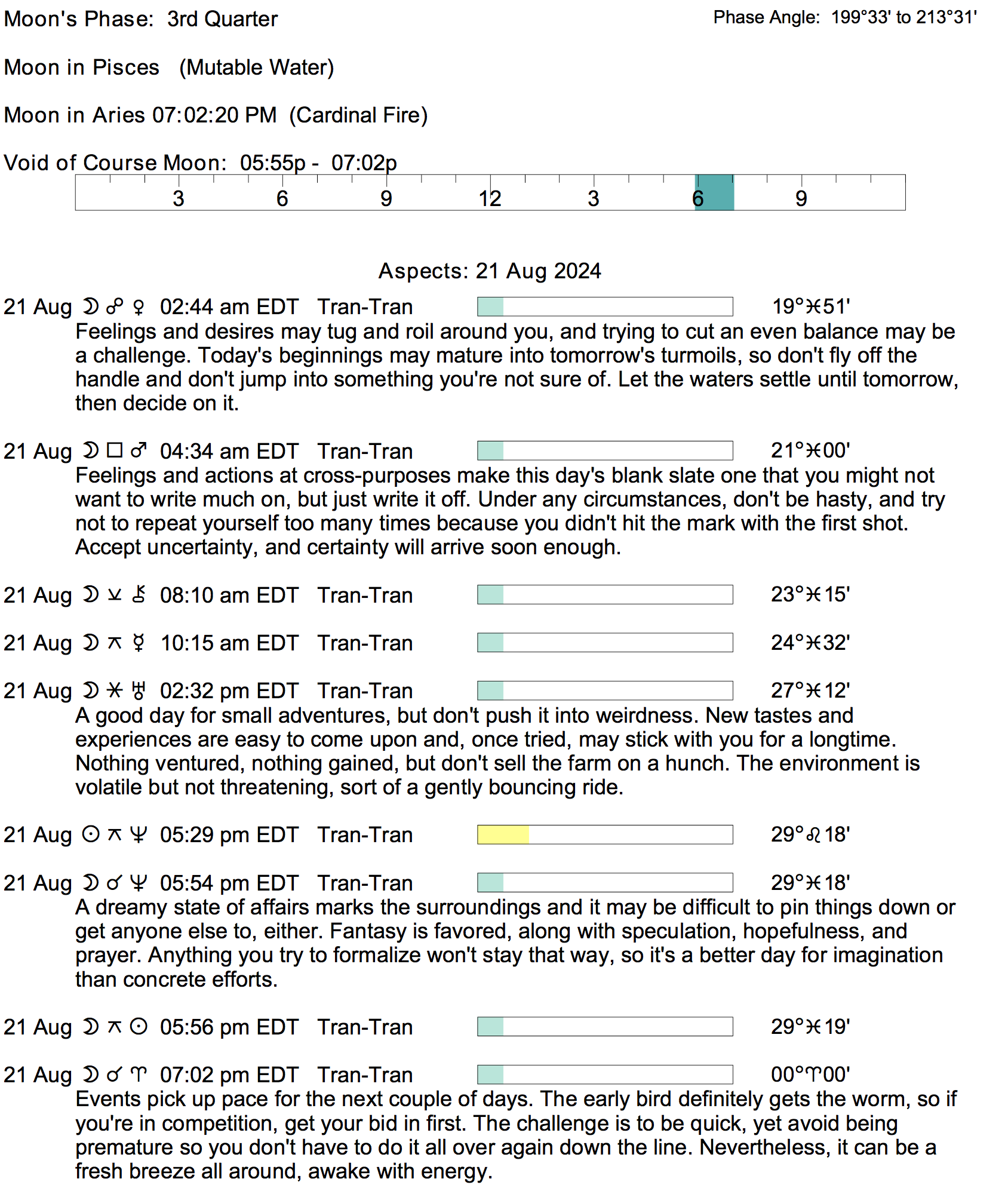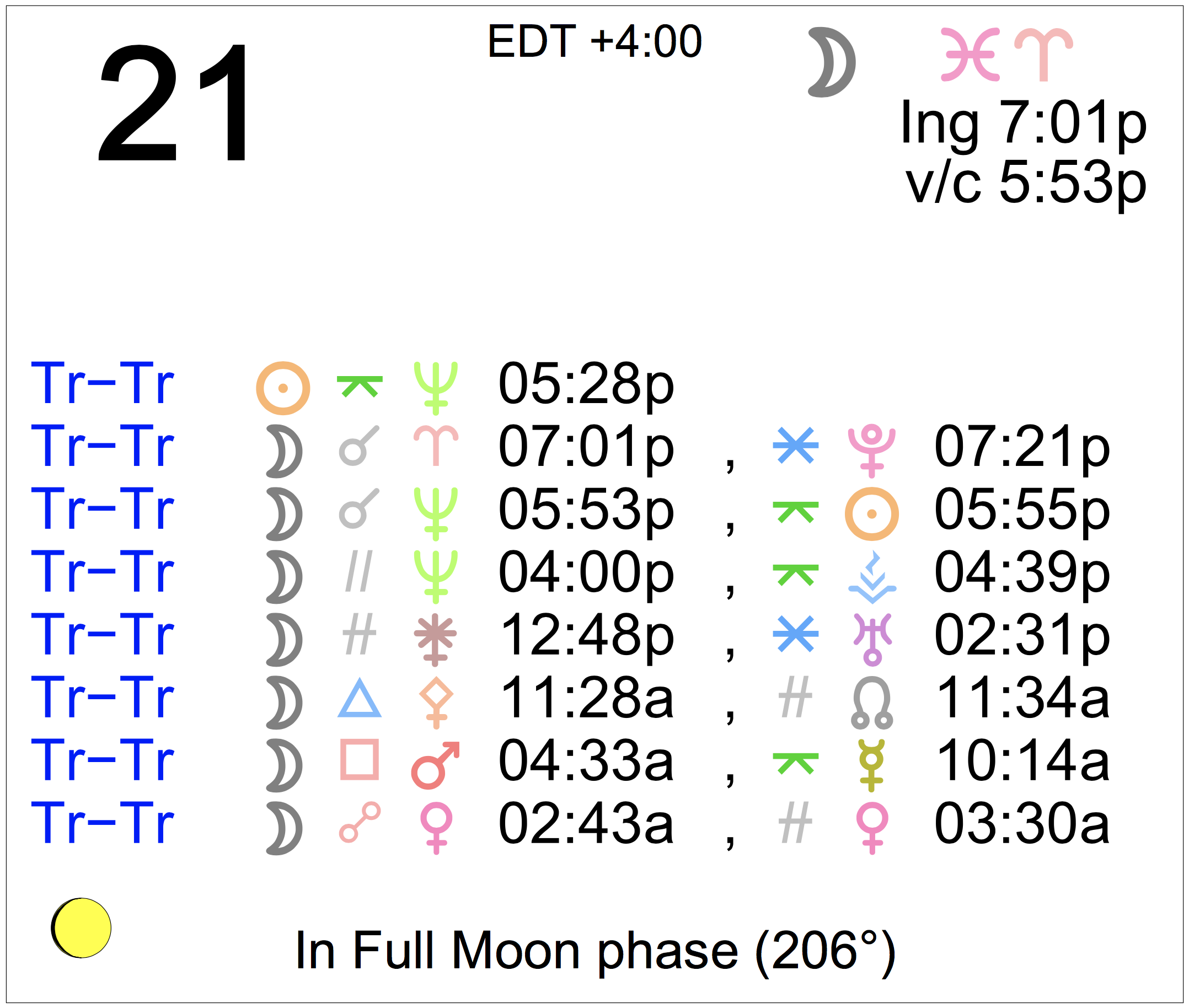 Planet Color Key: The longer the bar, the slower the aspecting planet, and the longer the duration of the planet’s transit.