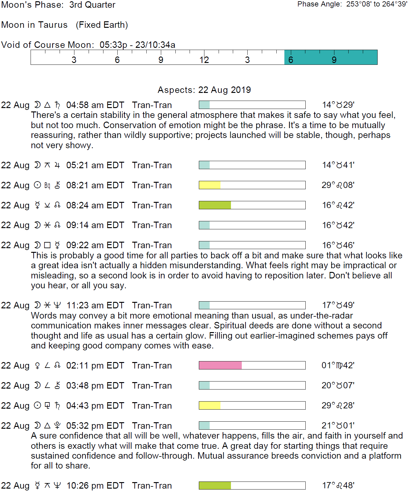 Planet Color Key: The longer the bar, the slower the aspecting planet and the longer the duration of the planet’s transit.