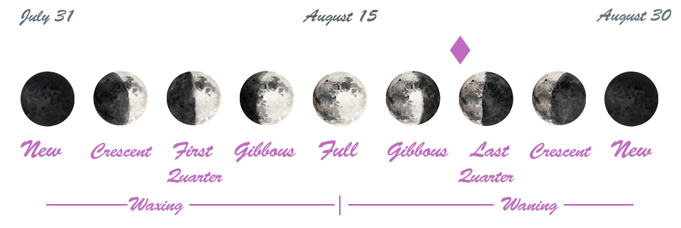 - The Full Moon occurred on August 15th in the sign of Aquarius, and the Last Quarter Moon will occur tomorrow.