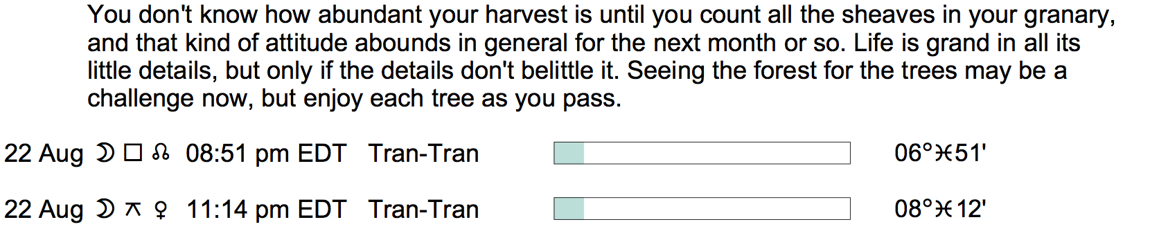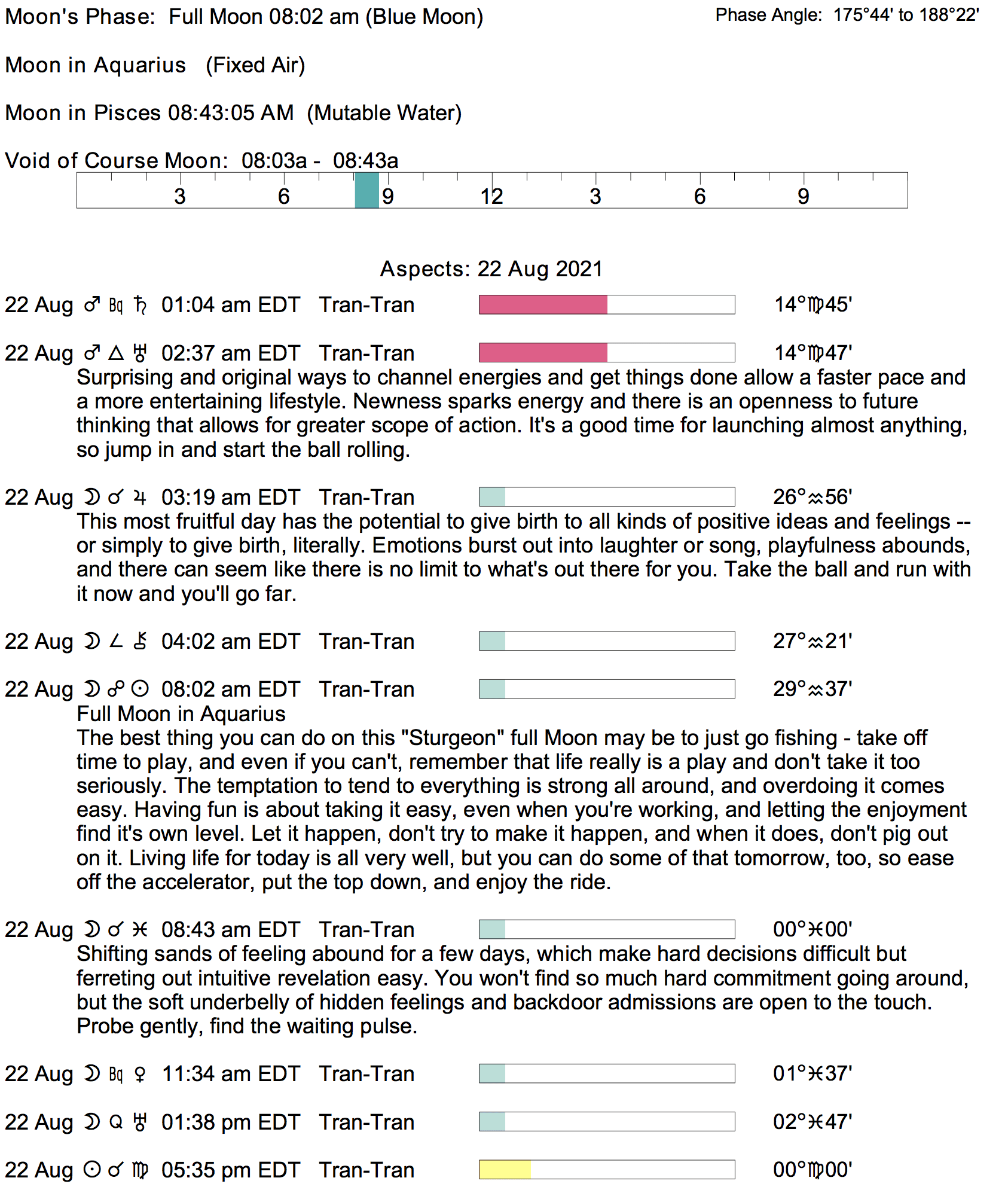 Planet Color Key: The longer the bar, the slower the aspecting planet, and the longer the duration of the planet’s transit.