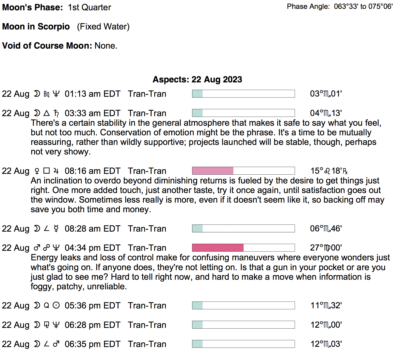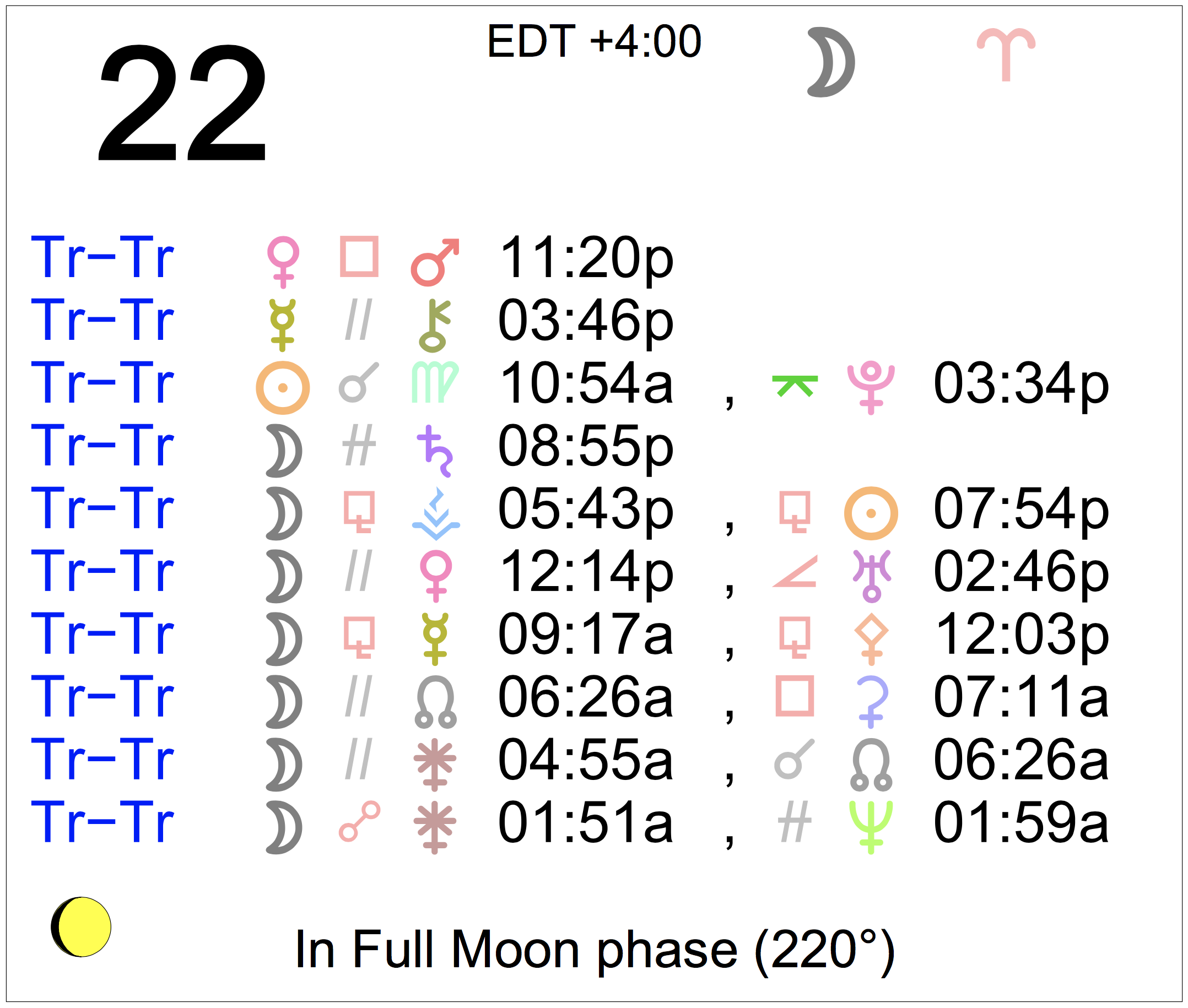Planet Color Key: The longer the bar, the slower the aspecting planet, and the longer the duration of the planet’s transit.