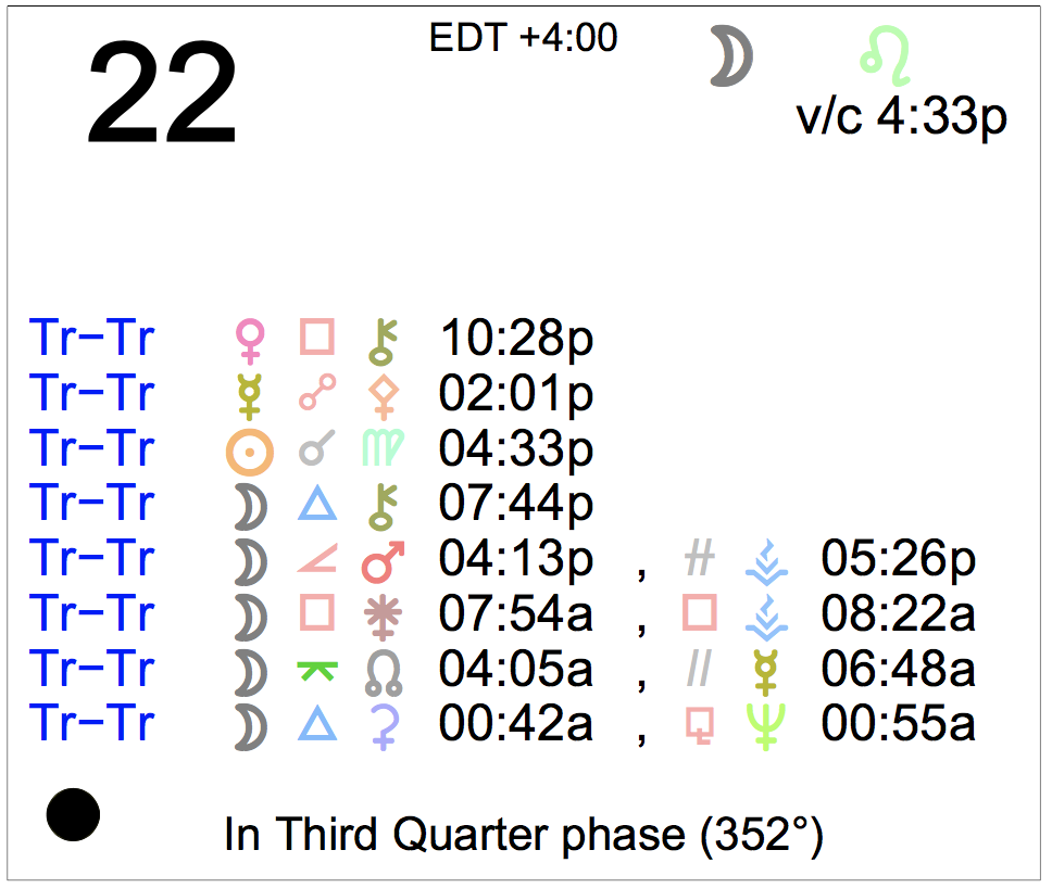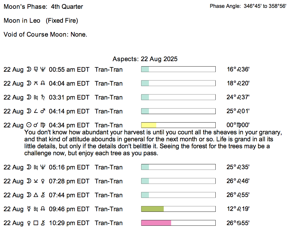 Planet Color Key: The longer the bar, the slower the aspecting planet, and the longer the duration of the planet’s transit.