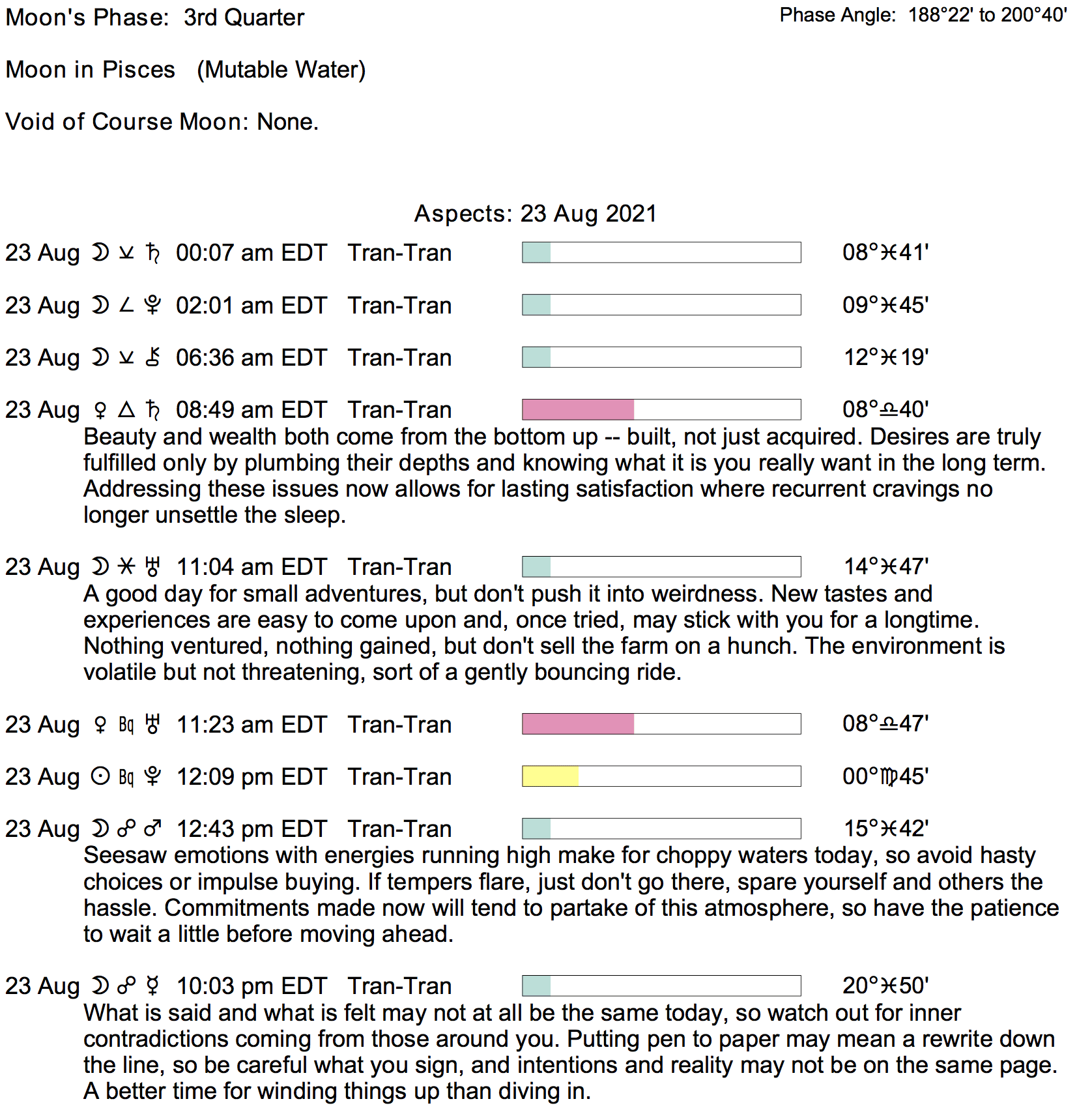 Planet Color Key: The longer the bar, the slower the aspecting planet, and the longer the duration of the planet’s transit.