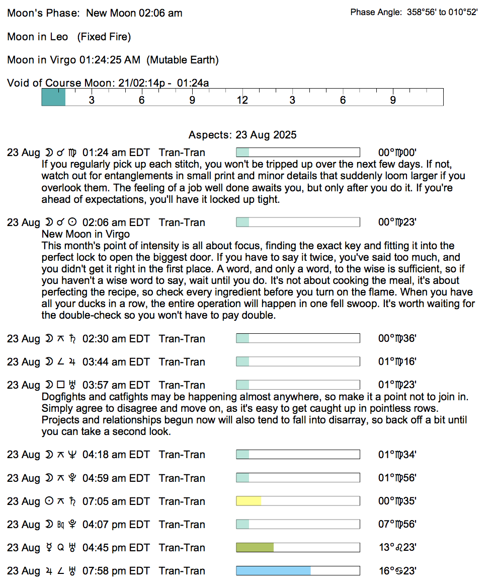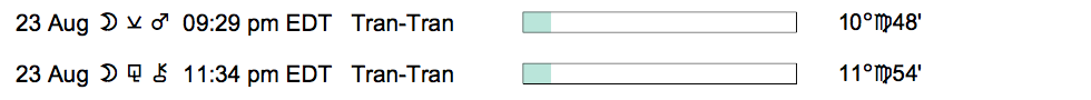 Planet Color Key: The longer the bar, the slower the aspecting planet, and the longer the duration of the planet’s transit.