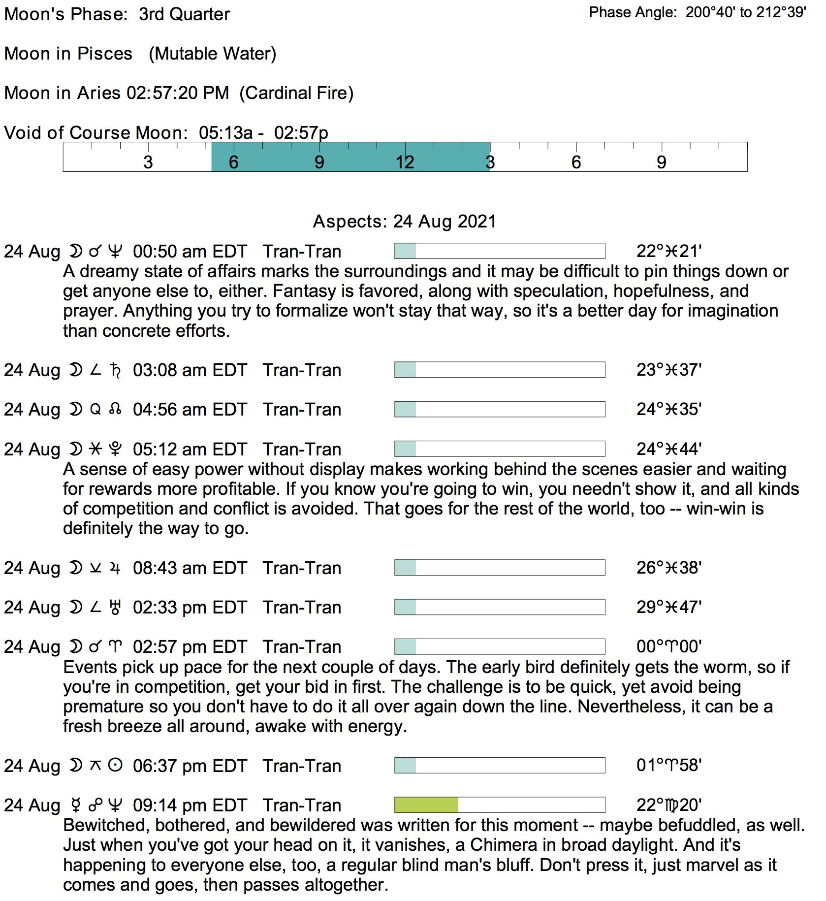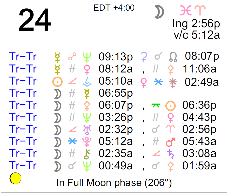 Planet Color Key: The longer the bar, the slower the aspecting planet, and the longer the duration of the planet’s transit.