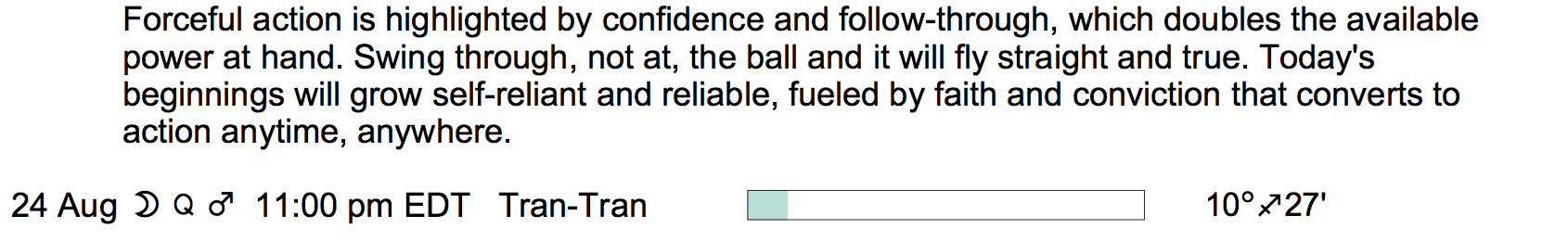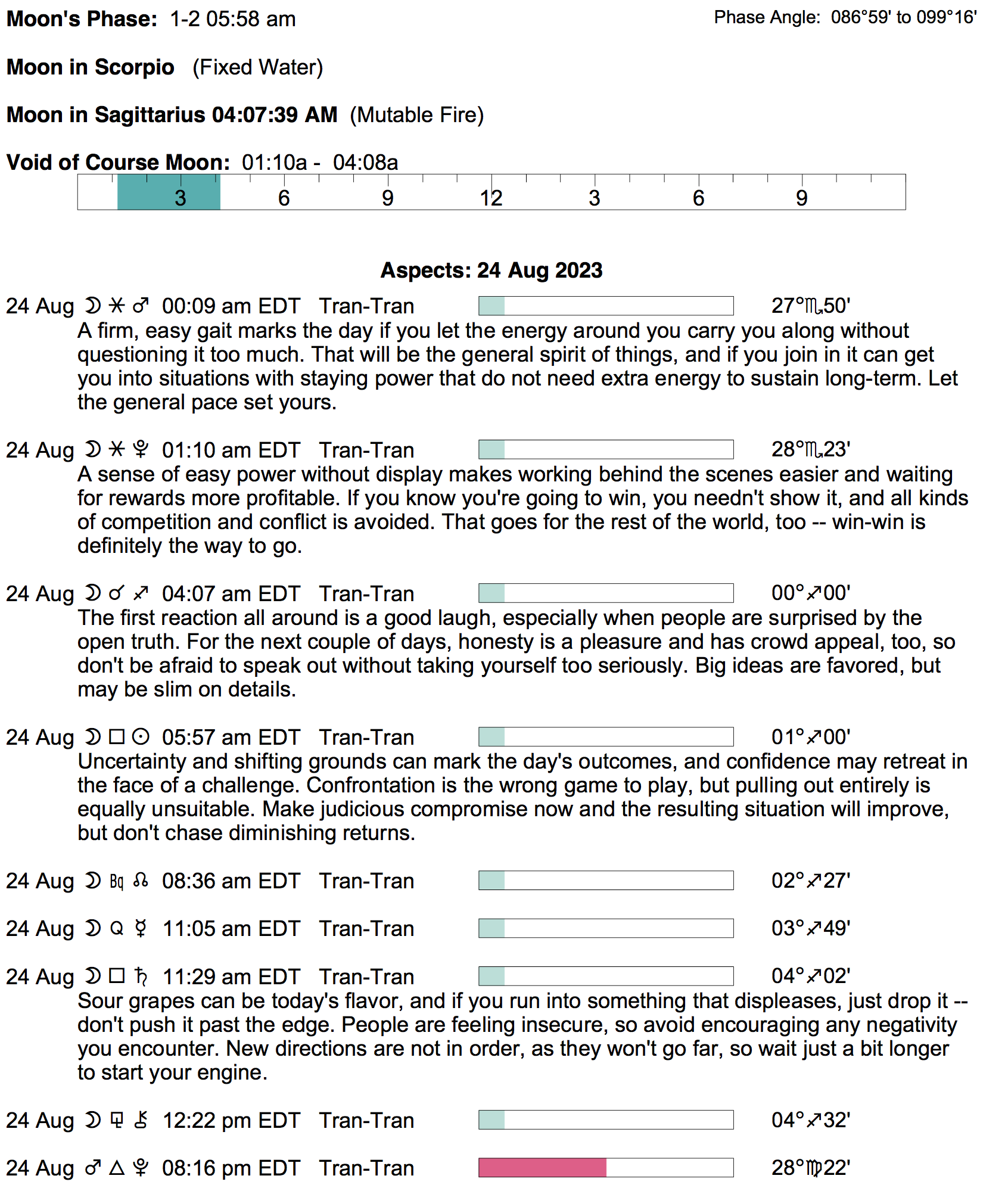 Planet Color Key: The longer the bar, the slower the aspecting planet, and the longer the duration of the planet’s transit.