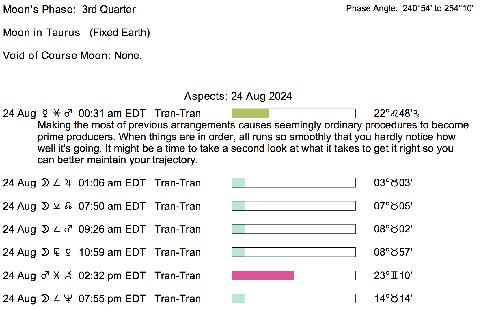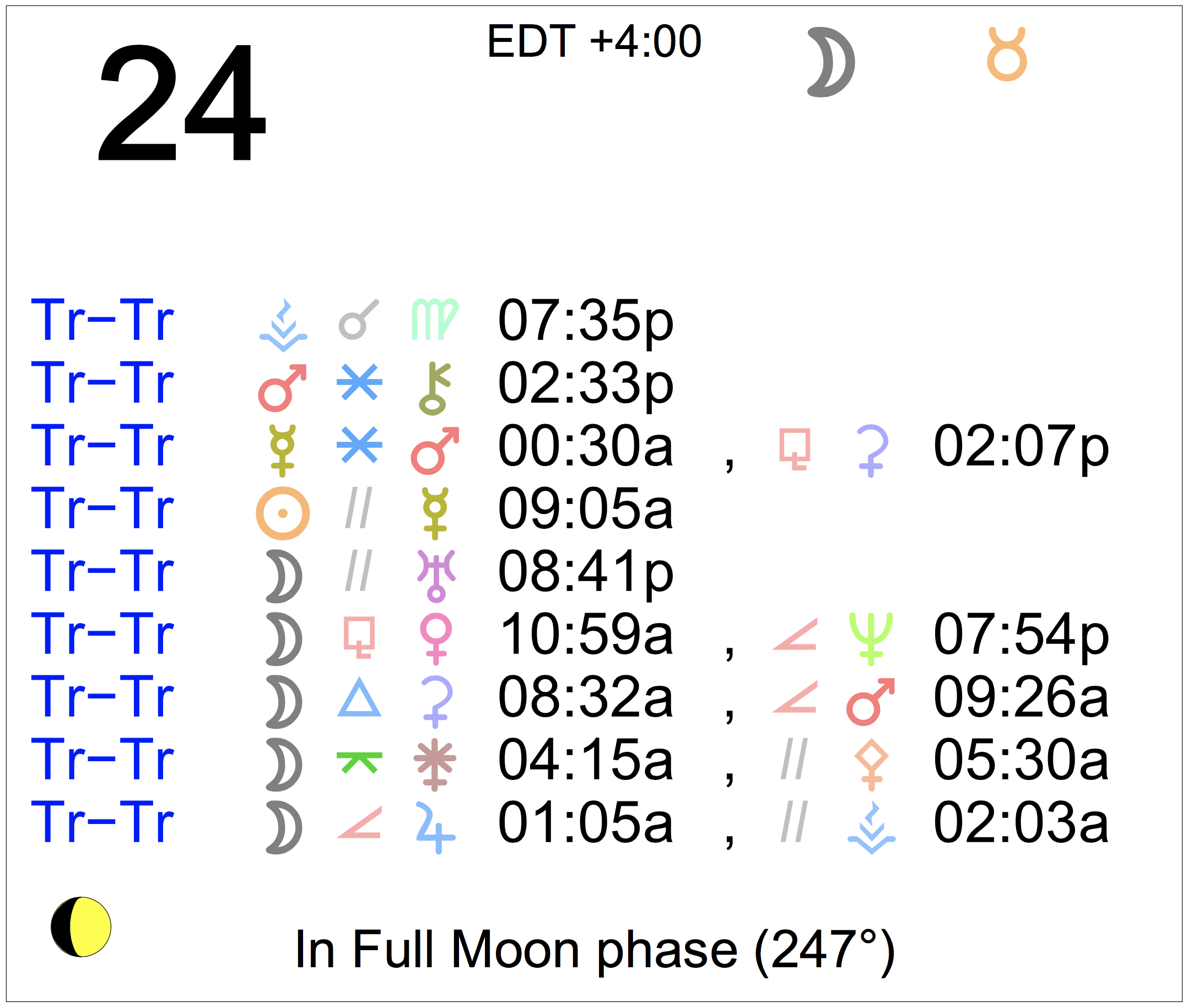 Planet Color Key: The longer the bar, the slower the aspecting planet, and the longer the duration of the planet’s transit.