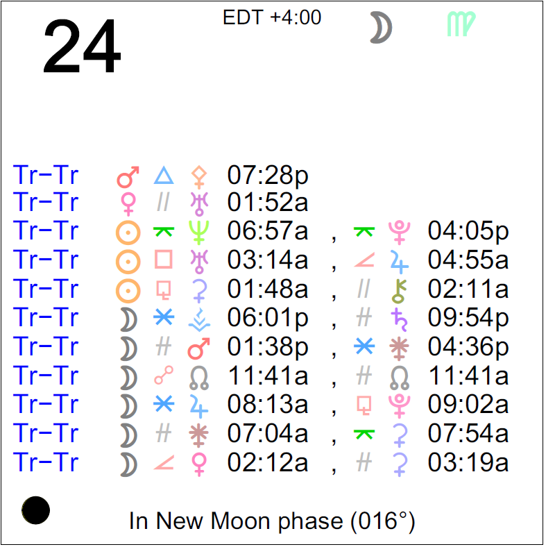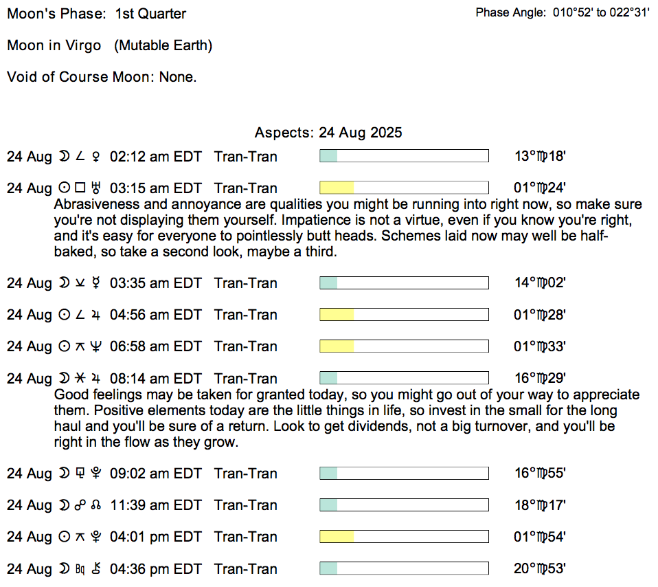 Planet Color Key: The longer the bar, the slower the aspecting planet, and the longer the duration of the planet’s transit.