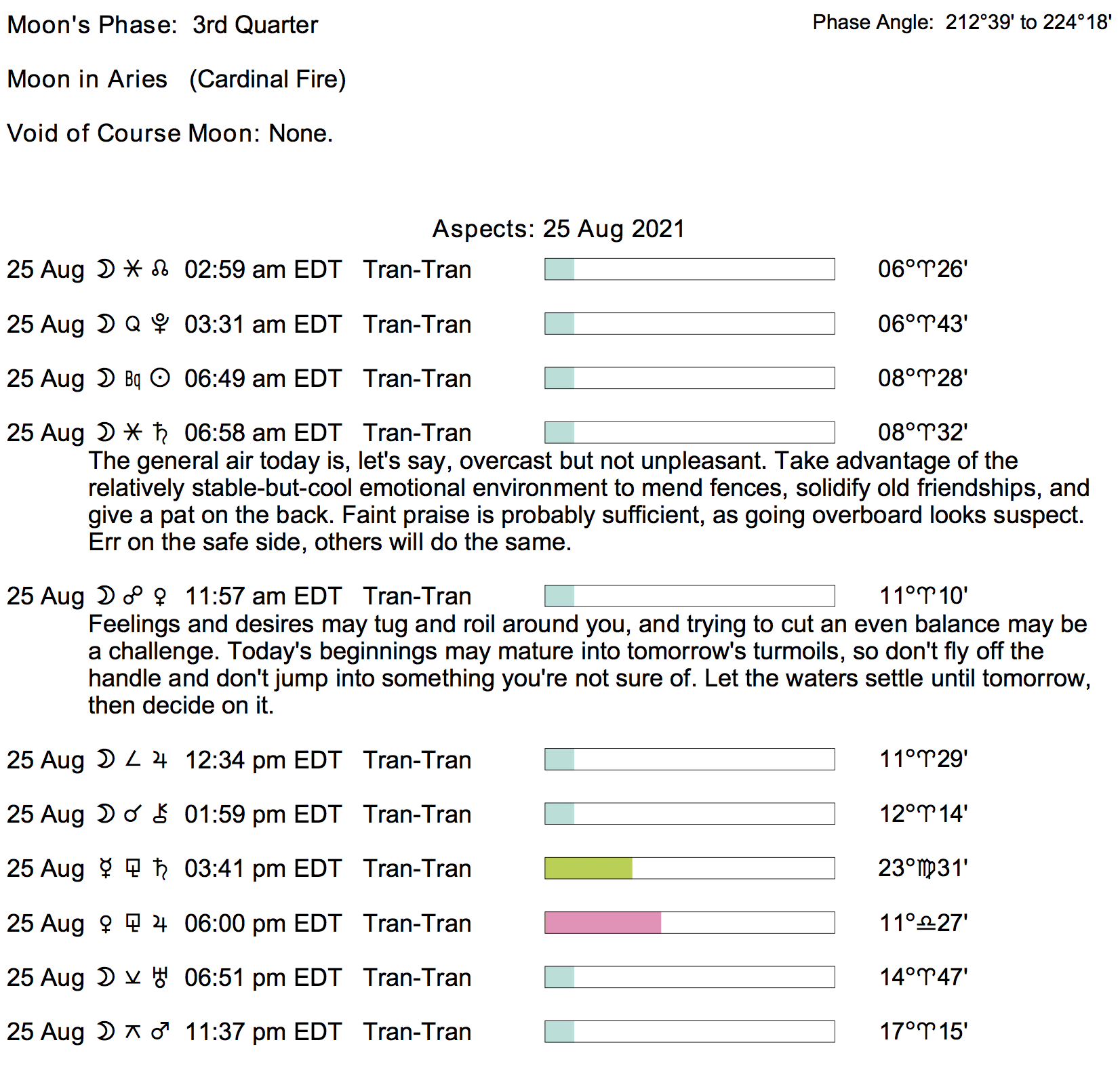 Planet Color Key: The longer the bar, the slower the aspecting planet, and the longer the duration of the planet’s transit.