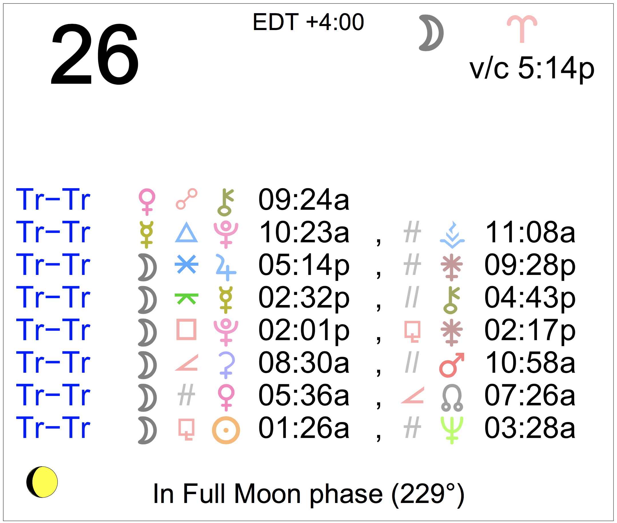 - A void Moon period occurs from 5:14 PM forward (until tomorrow at 12:26 AM).