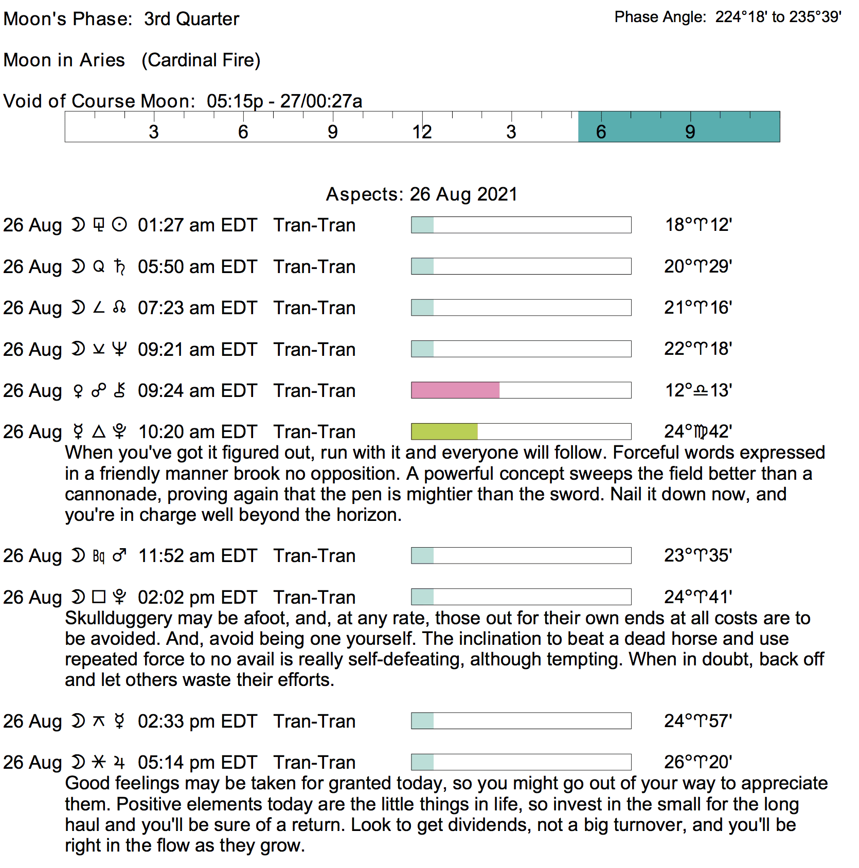 Planet Color Key: The longer the bar, the slower the aspecting planet, and the longer the duration of the planet’s transit.