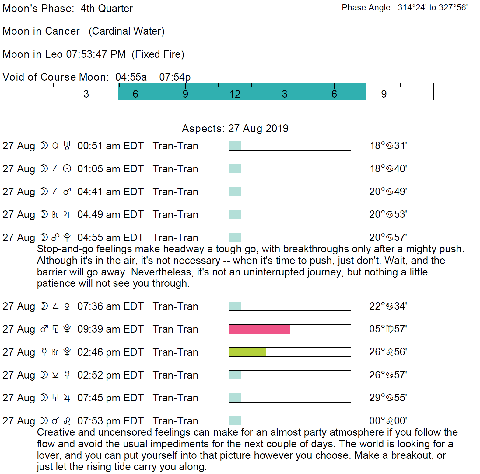 Planet Color Key: The longer the bar, the slower the aspecting planet and the longer the duration of the planet’s transit.