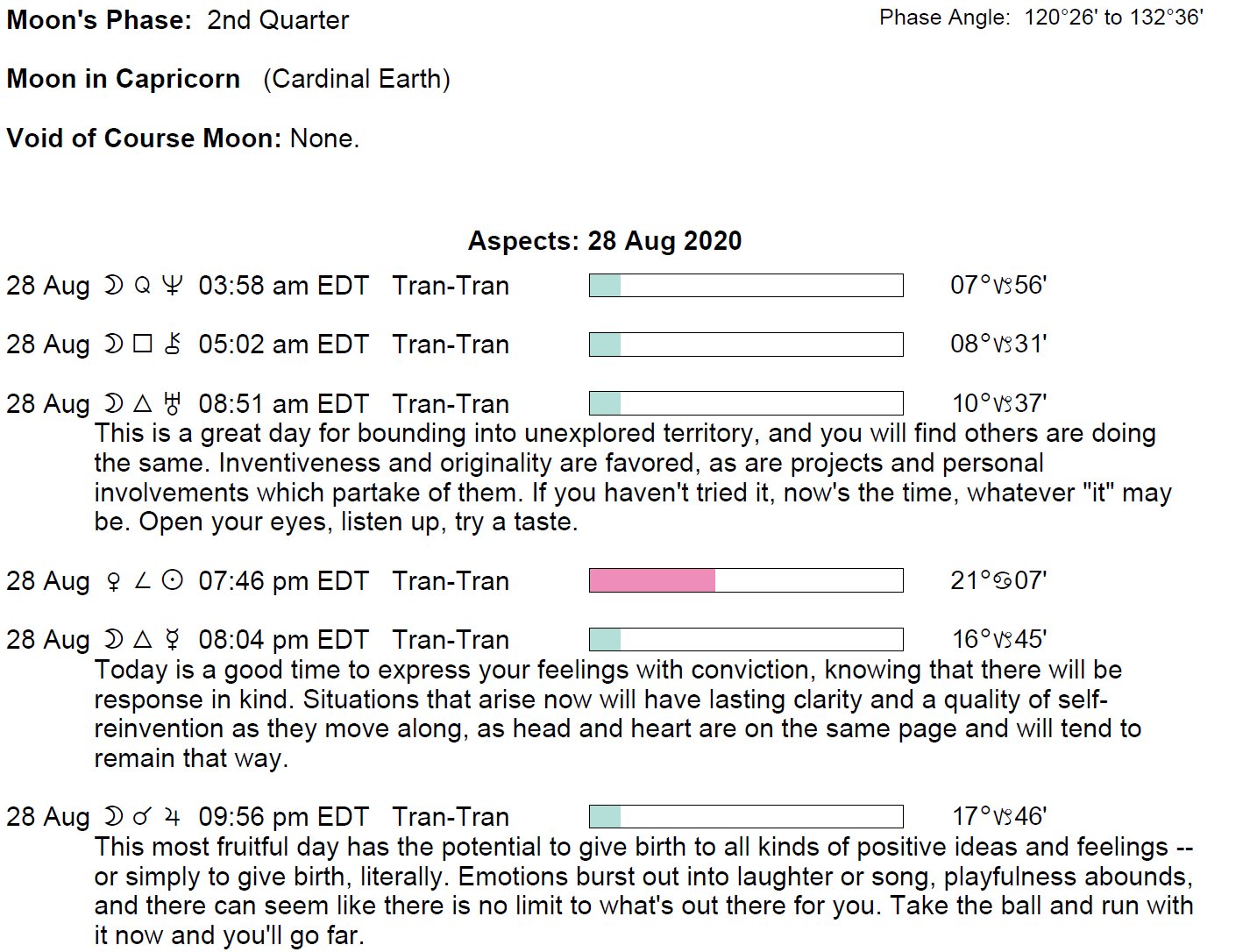 Planet Color Key: The longer the bar, the slower the aspecting planet and the longer the duration of the planet’s transit.