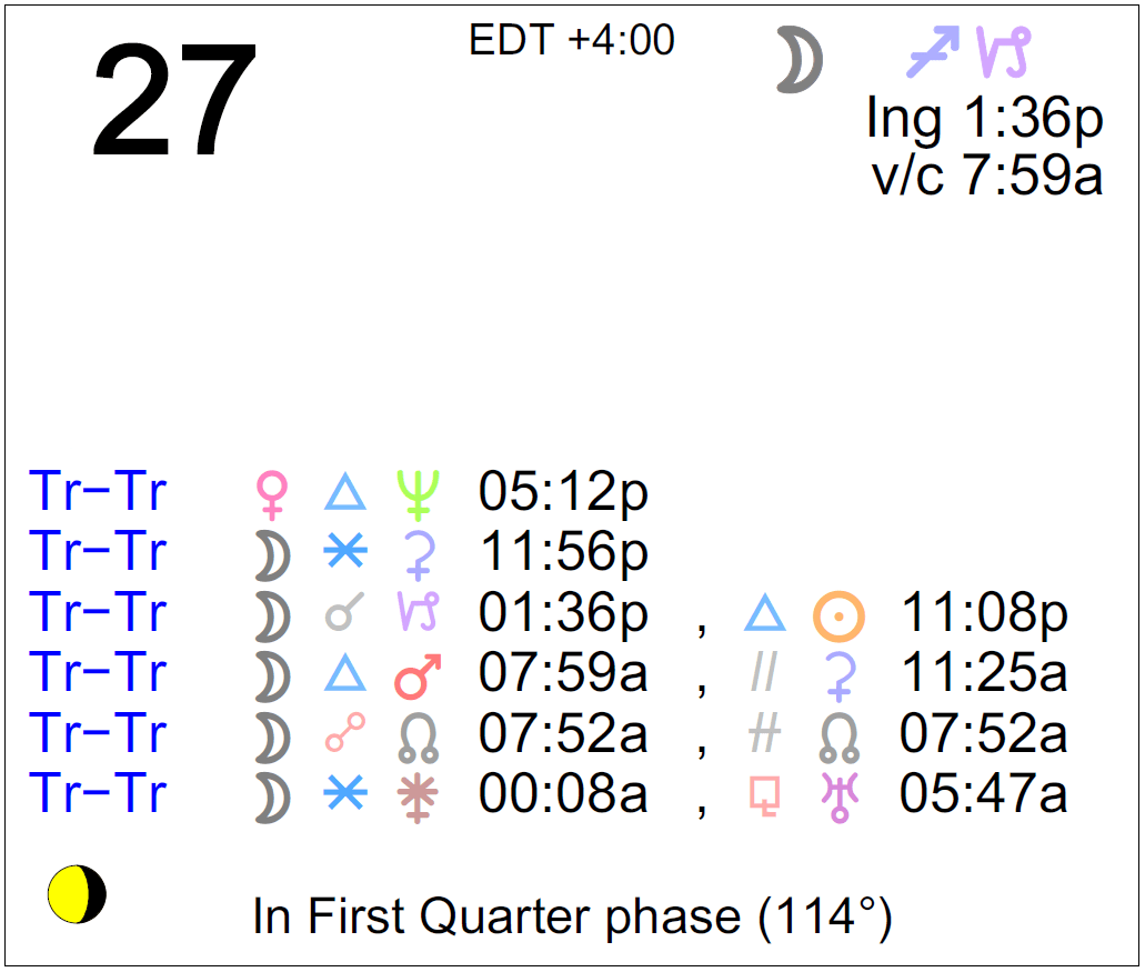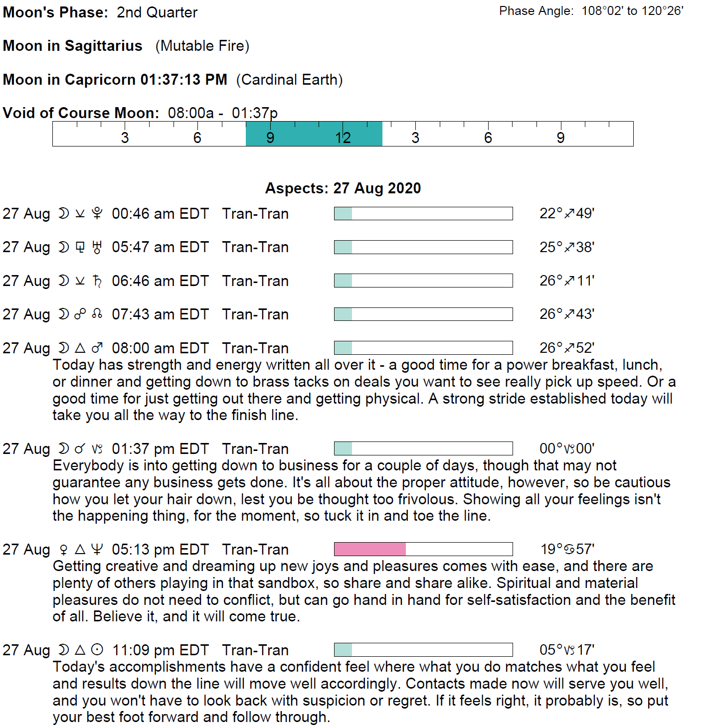 Planet Color Key: The longer the bar, the slower the aspecting planet and the longer the duration of the planet’s transit.