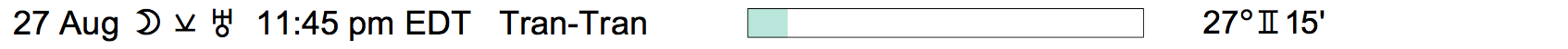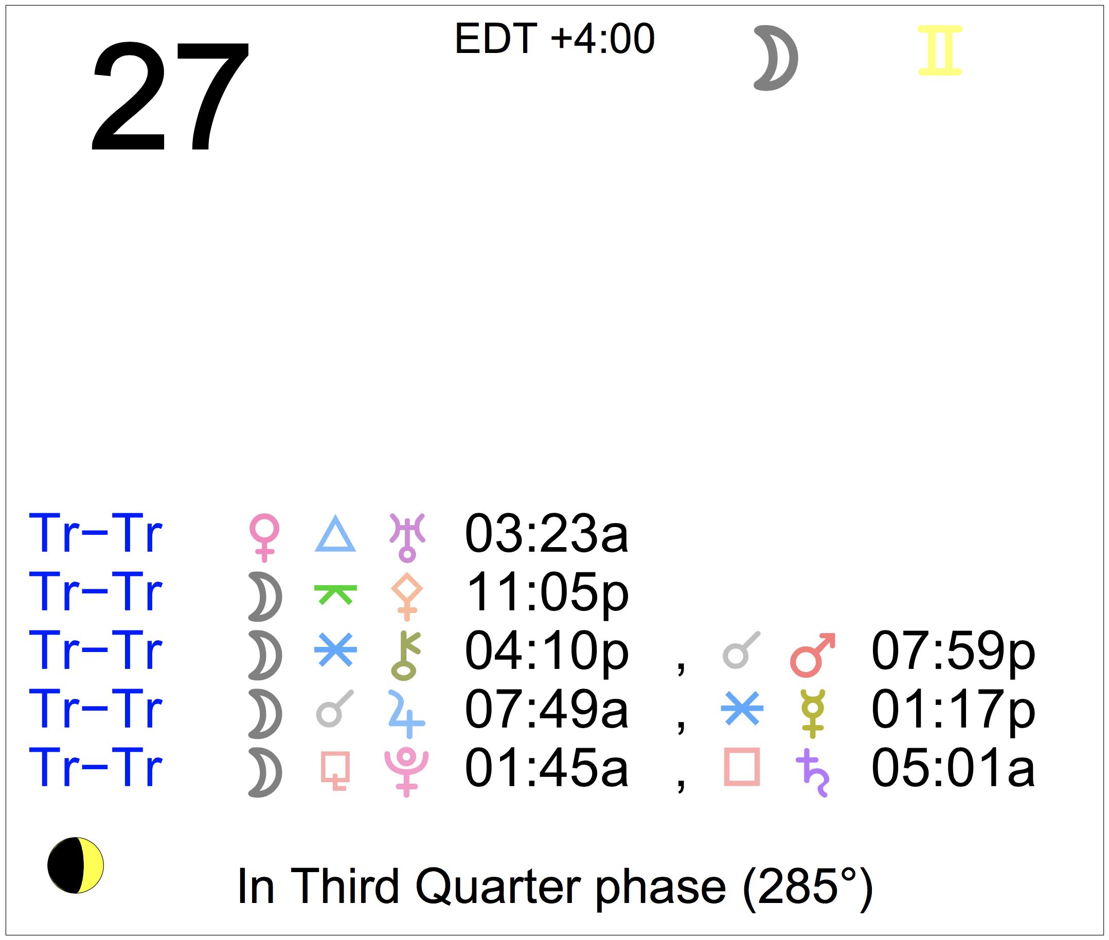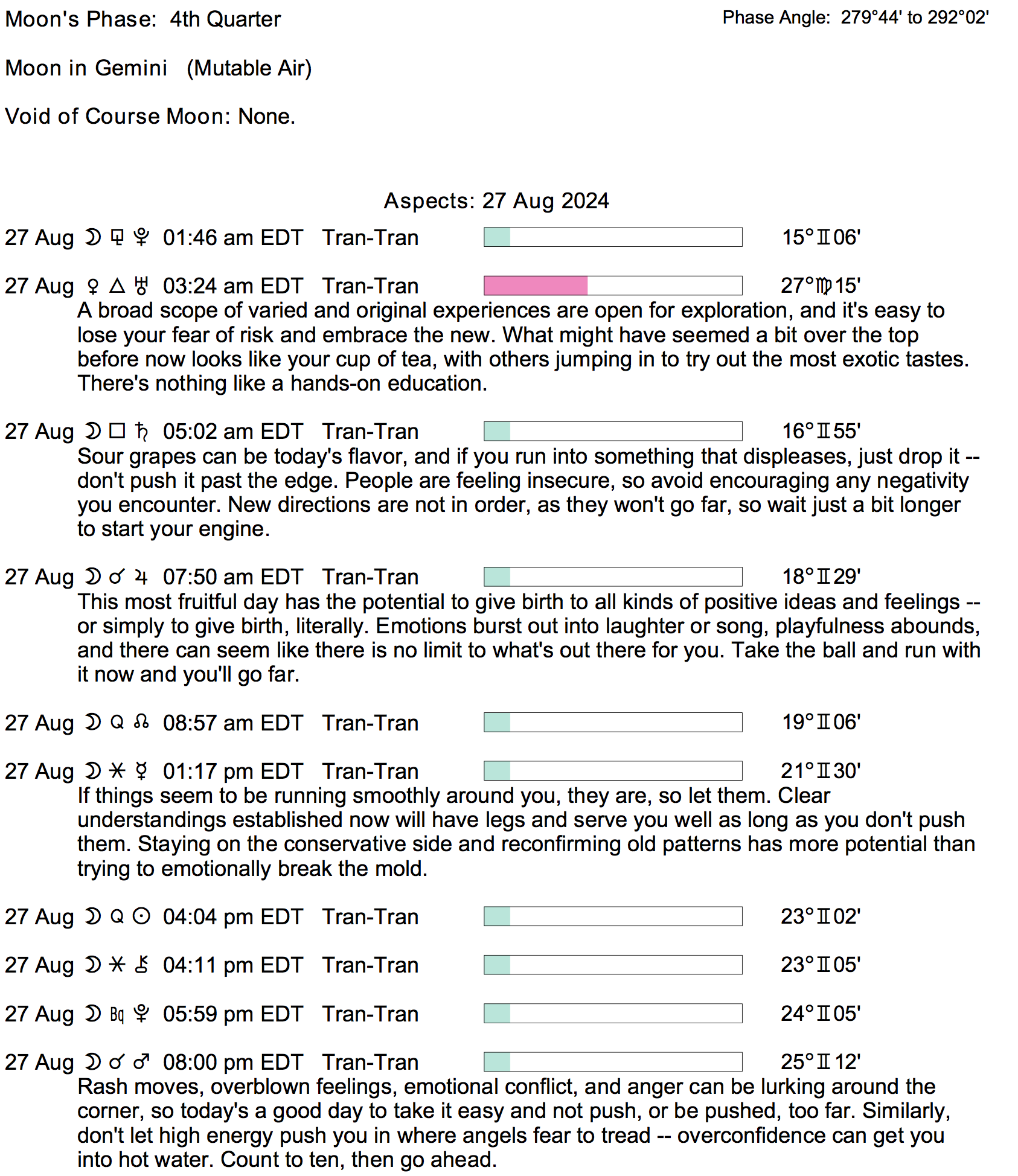 Planet Color Key: The longer the bar, the slower the aspecting planet, and the longer the duration of the planet’s transit.