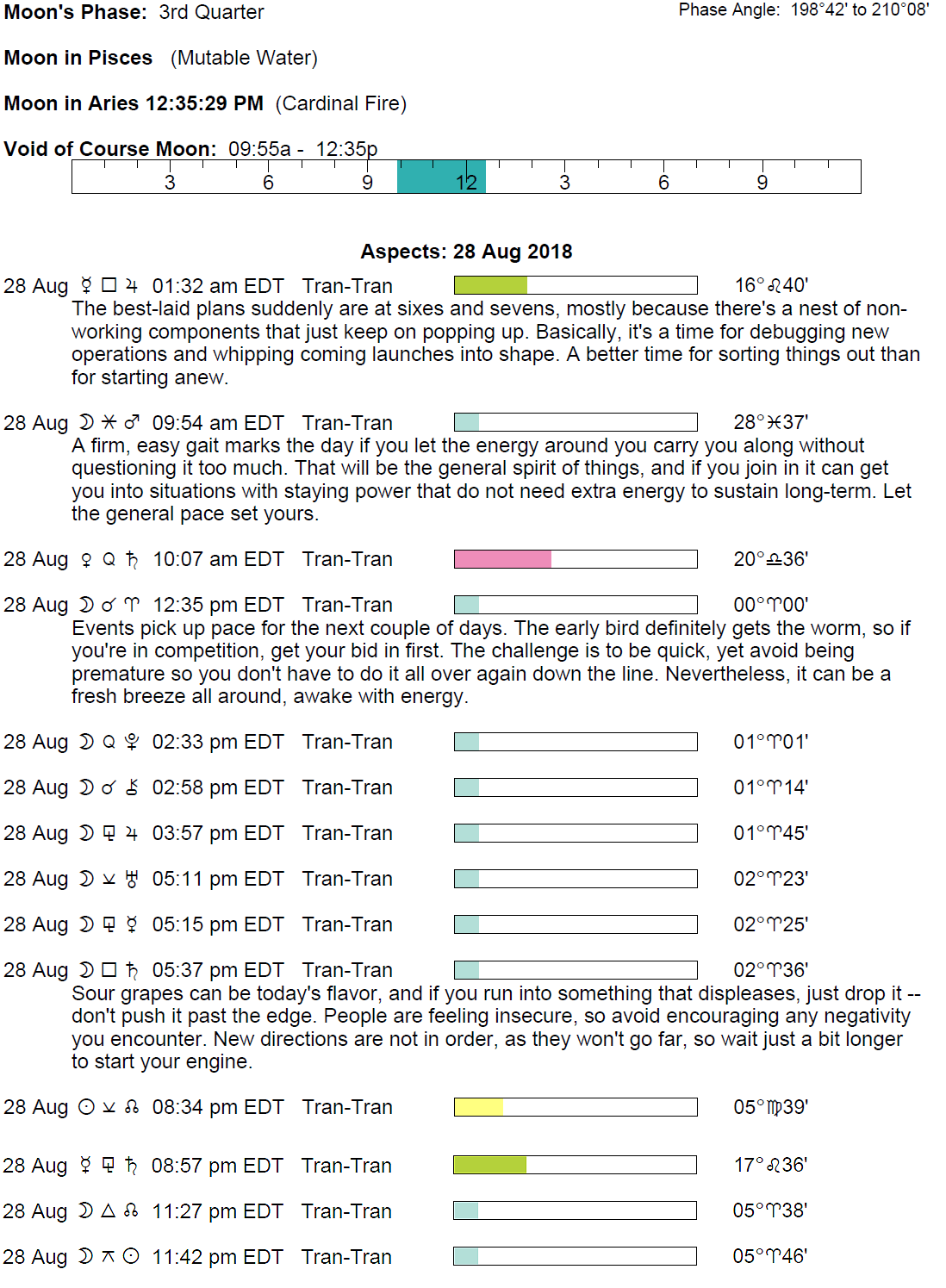 Planet Color Key: The longer the bar, the slower the aspecting planet and the longer the duration of the planet’s transit.